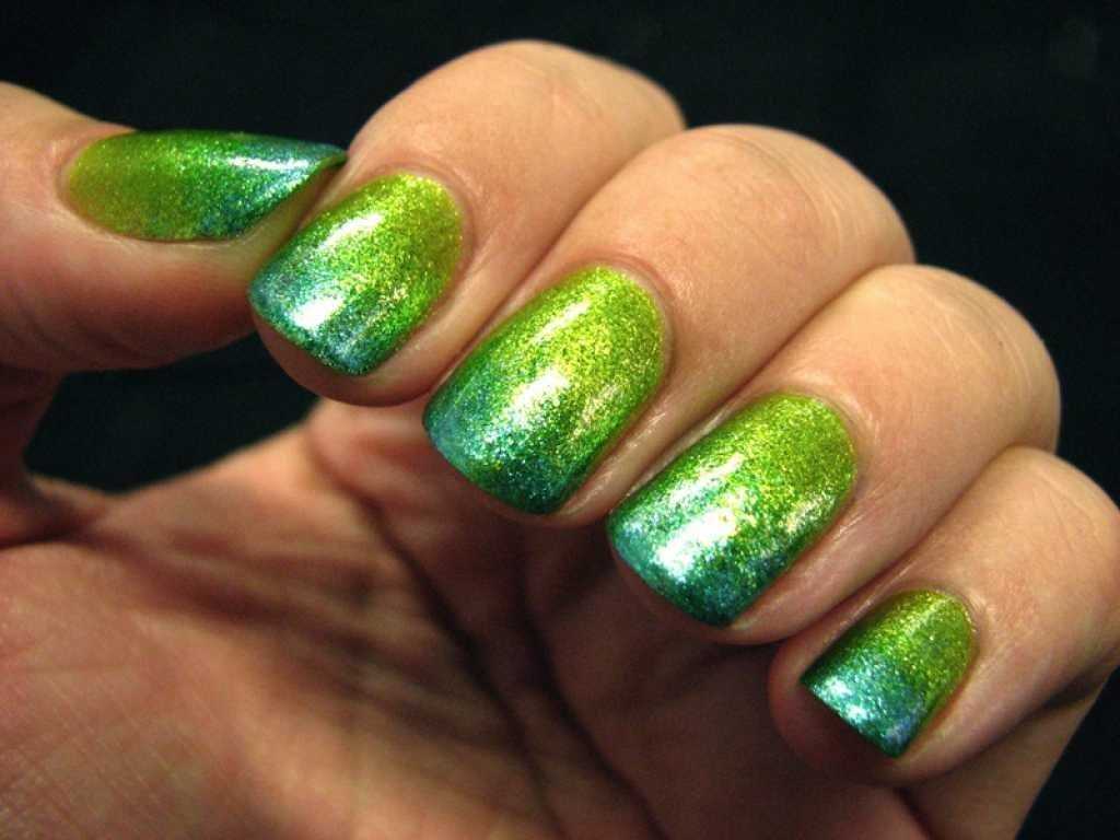 Каким бы разноцветным маникюр не был, в большинстве случае, в его цветовой гамме обязательно будет присутствовать зеленый цвет того или иного оттенка. Самым распространенным разноцветным дизайном является окрашивание отдельных ноготков в разные цвета. Также можно сделать разноцветный градиент.