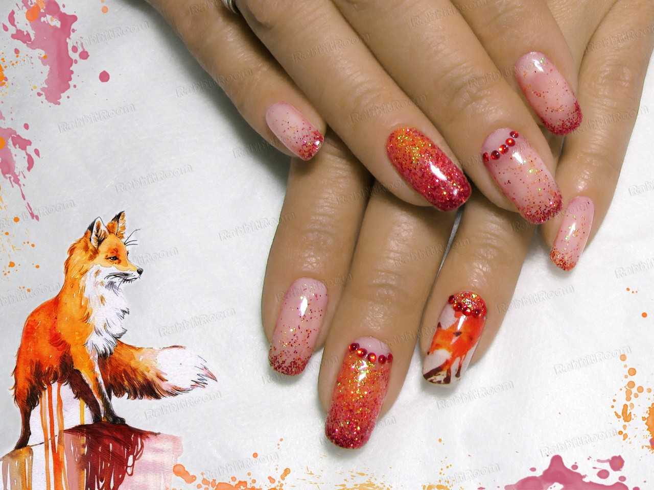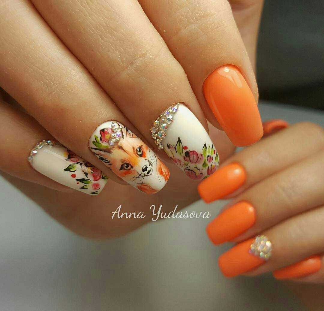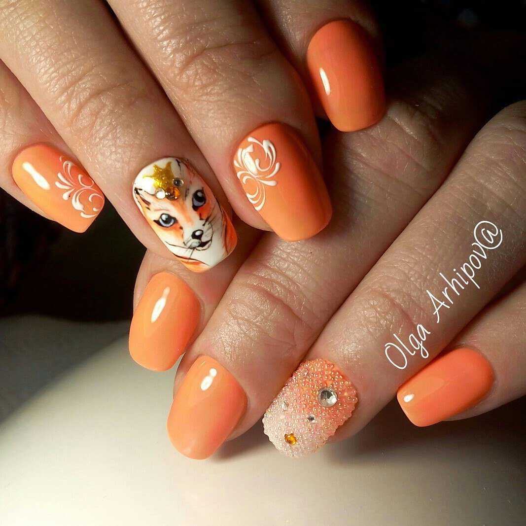 Дизайн оранжевого маникюра 2020: лисичка и другие животные
