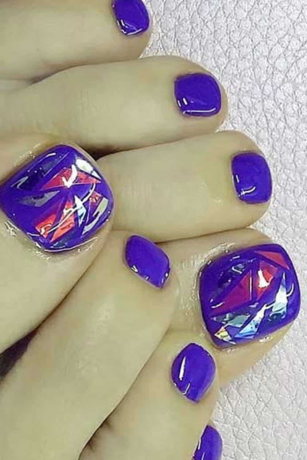 В этом сезоне мастера придают большое значение дизайну ногтей, выполненному в фиолетовых тонах. Данный насыщенный цвет хорошо сочетается с различными элементами декорирования. Для получения модного педикюра используются как новые материалы, так и классическое оформление