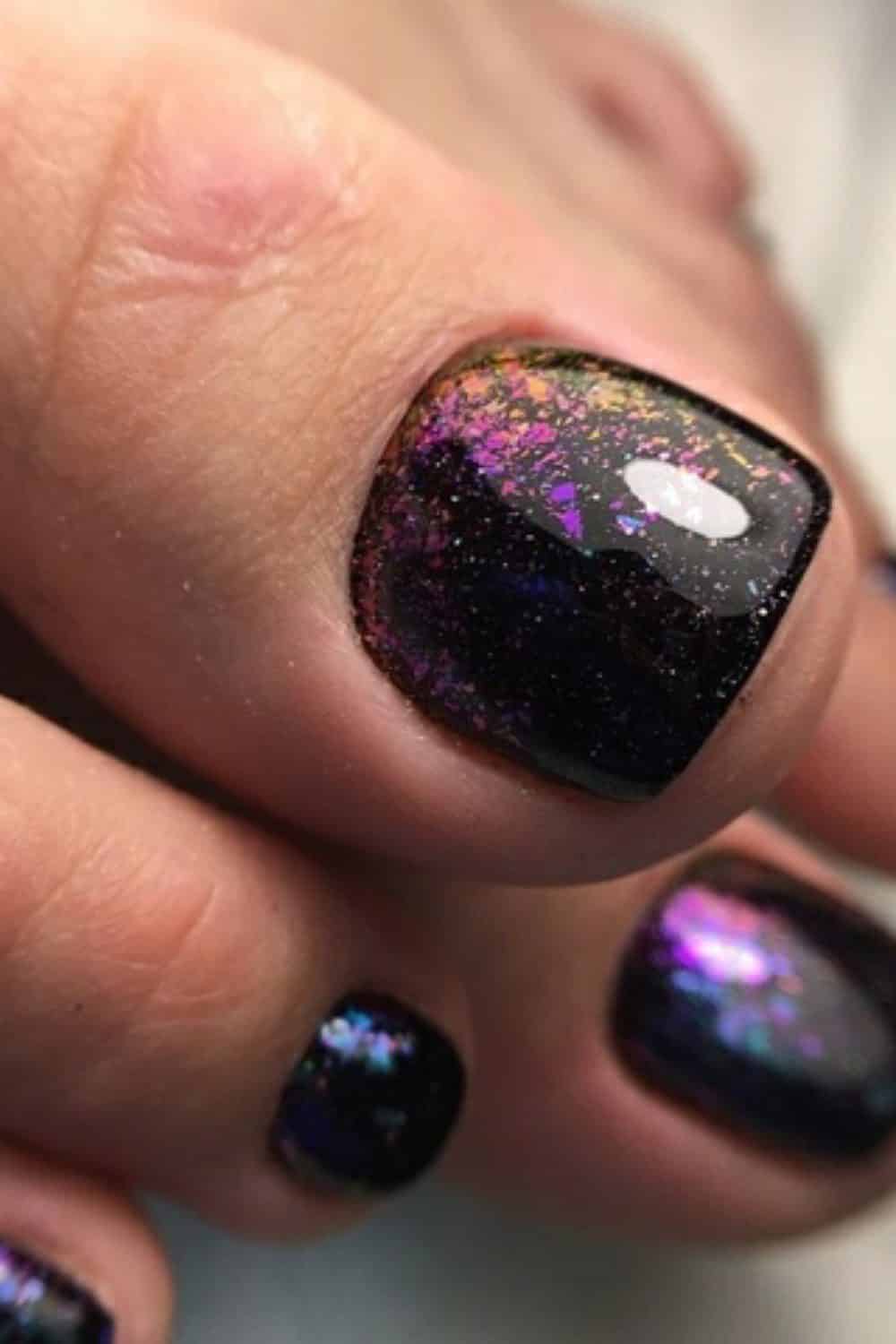 Среди оригинальных красивых вариантов педикюра обязательно стоит выделить оформление с эффектом космоса. Оно отличается невероятной глубиной и сочетанием россыпи различных частичек, создающих ассоциации с космическим пространством.