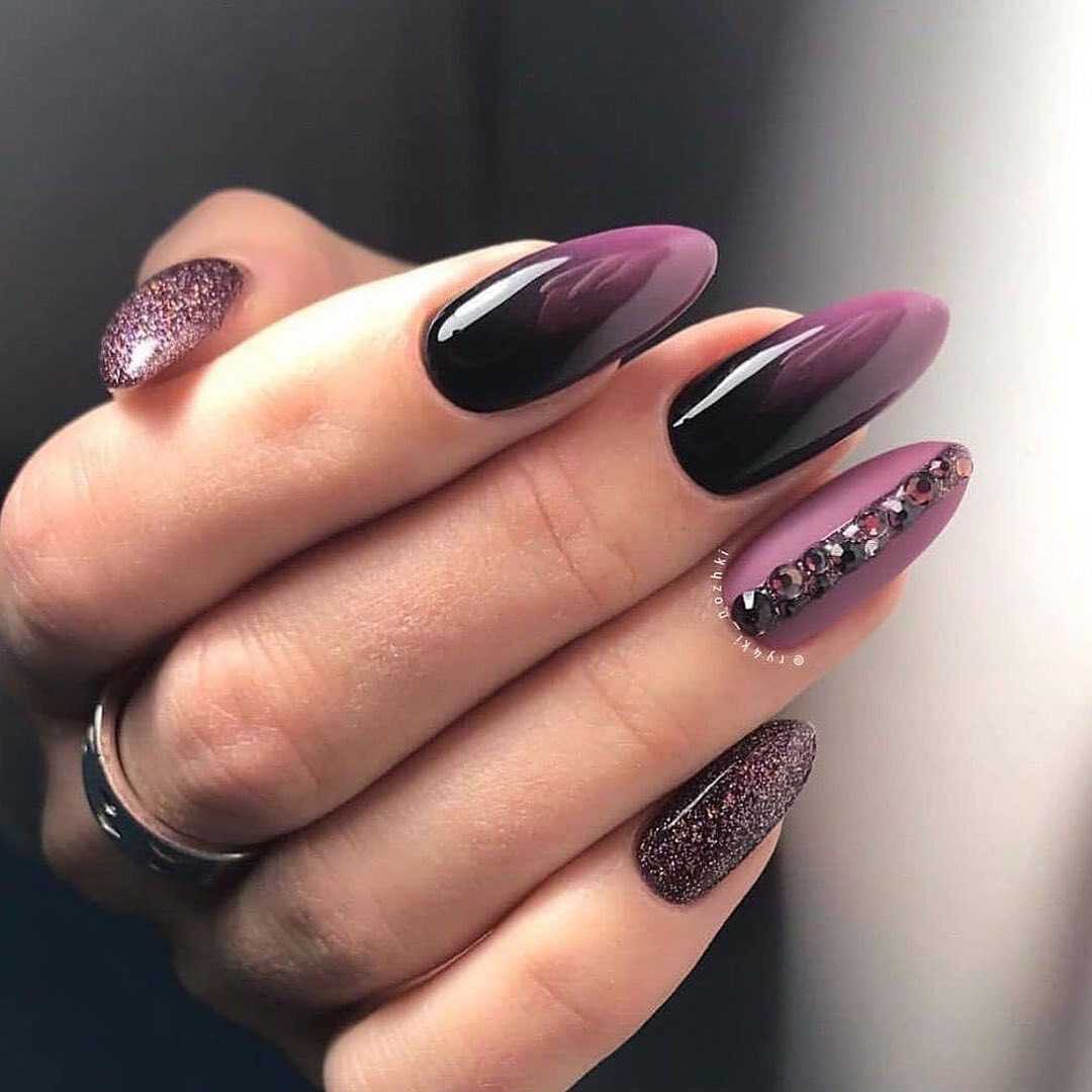 Темно – сиреневый отлично сочетается с черным и подходит для создания градиента. Особенно эффектно он будет смотреться в глянце. Украсить темные ногти можно бархатом, стразами и полосками. Глиттерная втирка создаст эффект космоса.