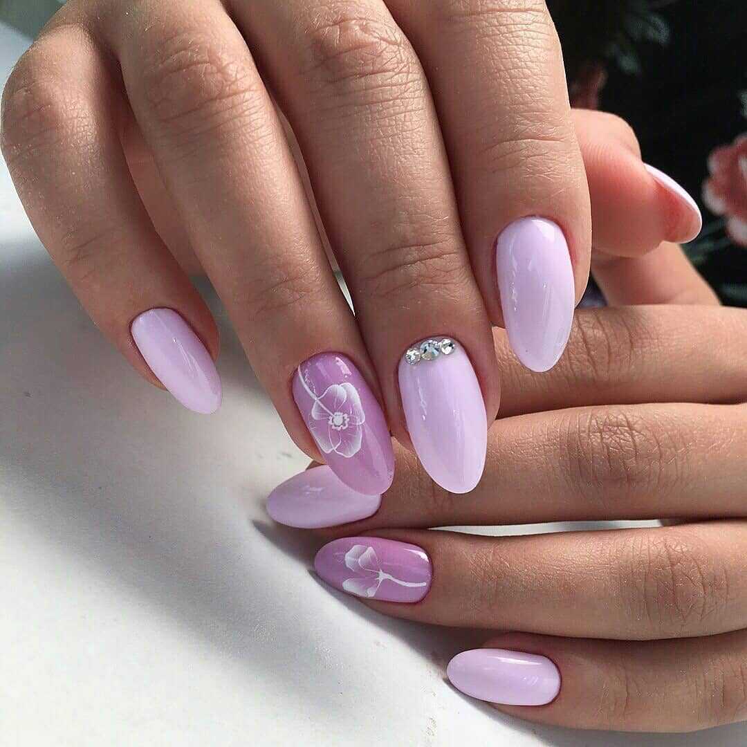 Пастельные тона чаще всего используют в классическом варианте сиреневого маникюра. Пастель хорошо подойдет для повседневного лука, она вписывается в офисный стиль и при этом дополнительно придает образу нежности. Стандартный декор для ногтей подобного цвета – флористические принты и блестки.