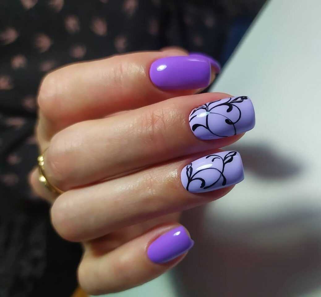 Для короткой длины отлично подойдут оттенки средней интенсивности. Они визуально удлиняют ноготь, поэтому можно будет обойтись без наращивания. Оптимальный дизайн сиреневого маникюра для коротких ноготках — матовое покрытие иди градиент. А вот от яркого глиттера или фольги в дизайне лучше отказаться.
