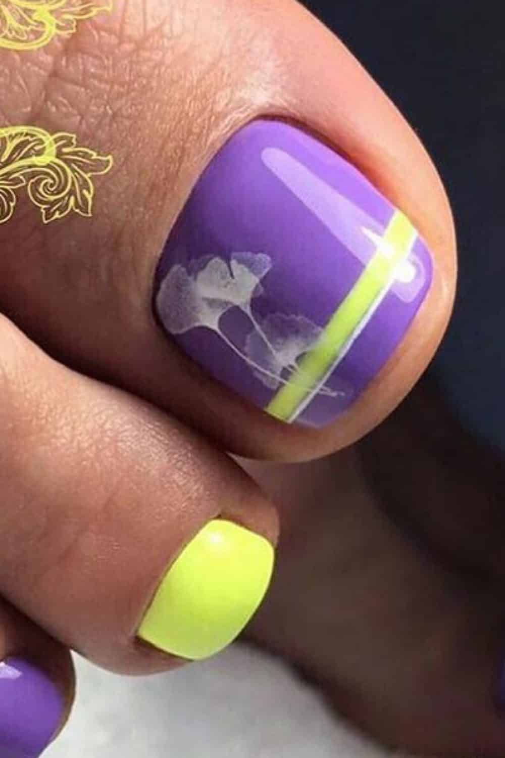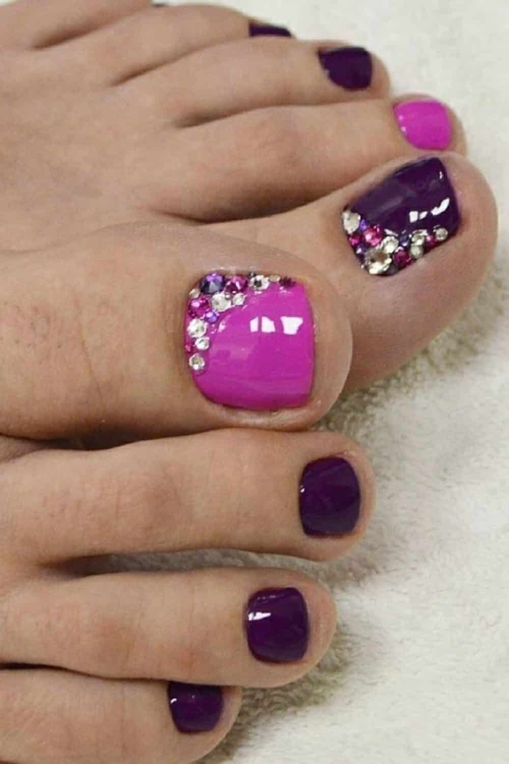 Достаточно популярным решением для покрытия ногтей признаны сочетания светлых оттенков и более глубокой палитры. К таким вариантам относится фиолетовый педикюр, в котором одна из ногтевых пластин оформляется розовым лаком.