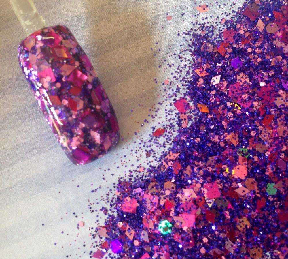 Кроме этого, нередко ноготь покрывают гель-лаком фиолетового цвета и подмешивают туда множество разноцветных блесток. Или берут уже готовый лак с глиттером – так называемый “мокрый”. Таким образом получается насыщенный, оригинальный и интересный цвет.