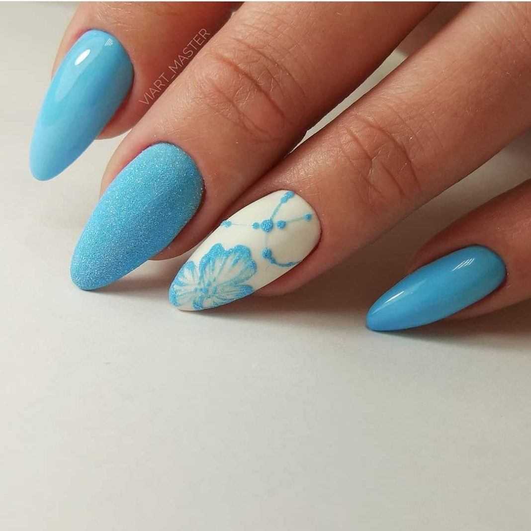 Синий маникюр прелестен на ноготках короткой длины и чудесно дополнит дизайн длинных, особенно, если вы обратите внимание на небесные оттенки гель-лаков. Форма синих ногтей также может быть разной