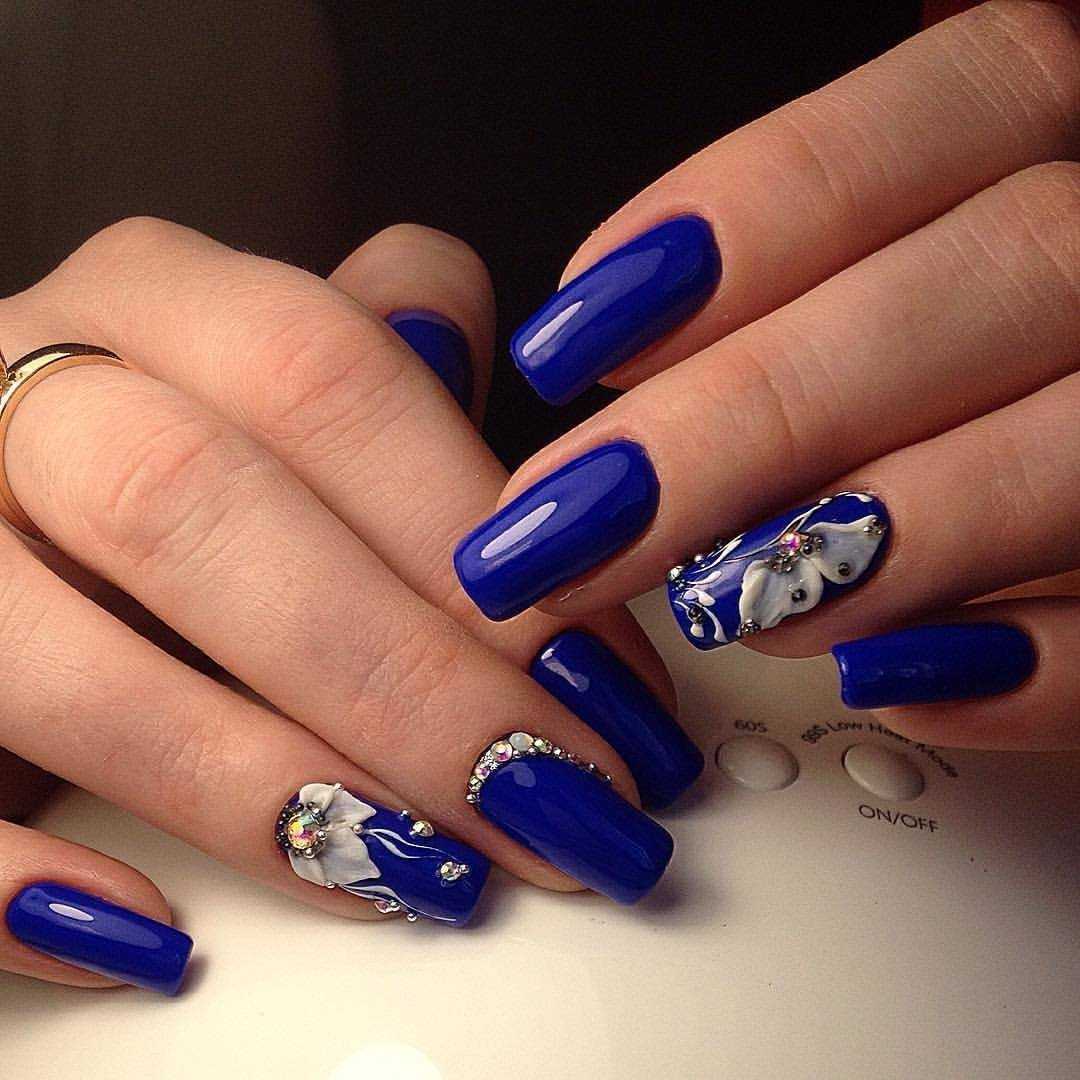 Синий маникюр уместен для повседневных и вечерних образов и будет отличаться декором и оформлением