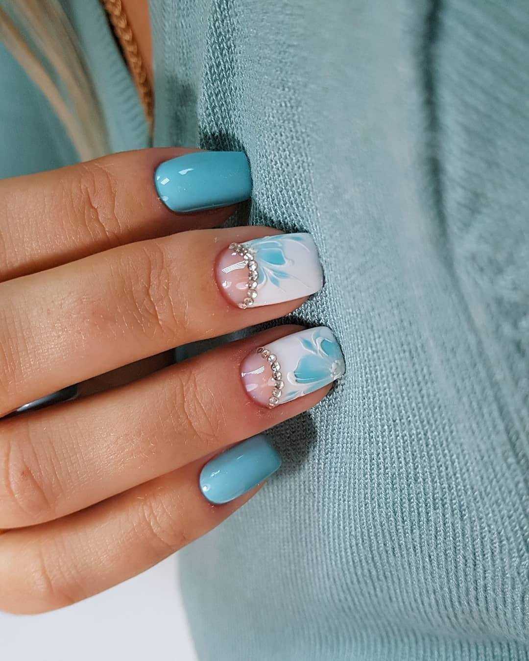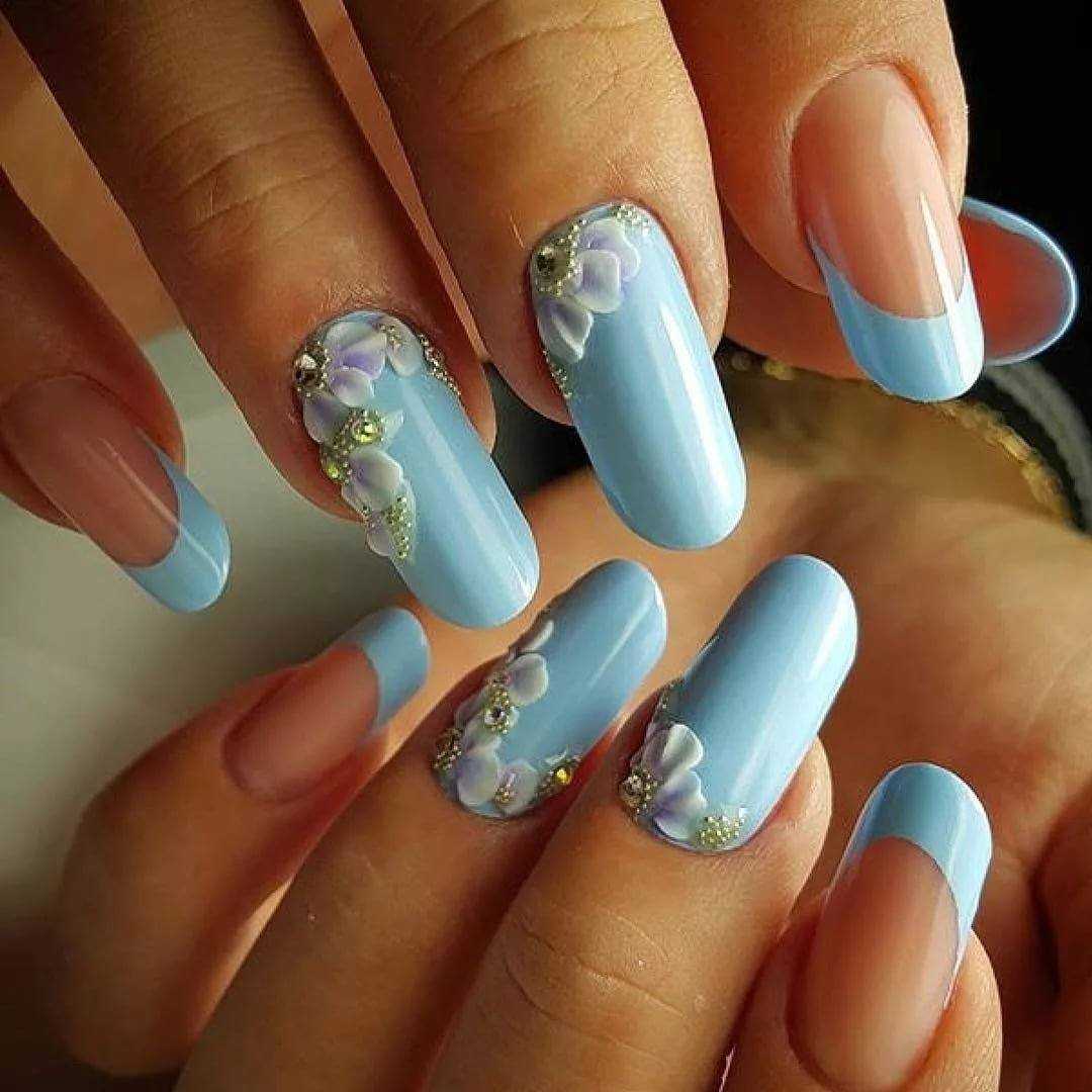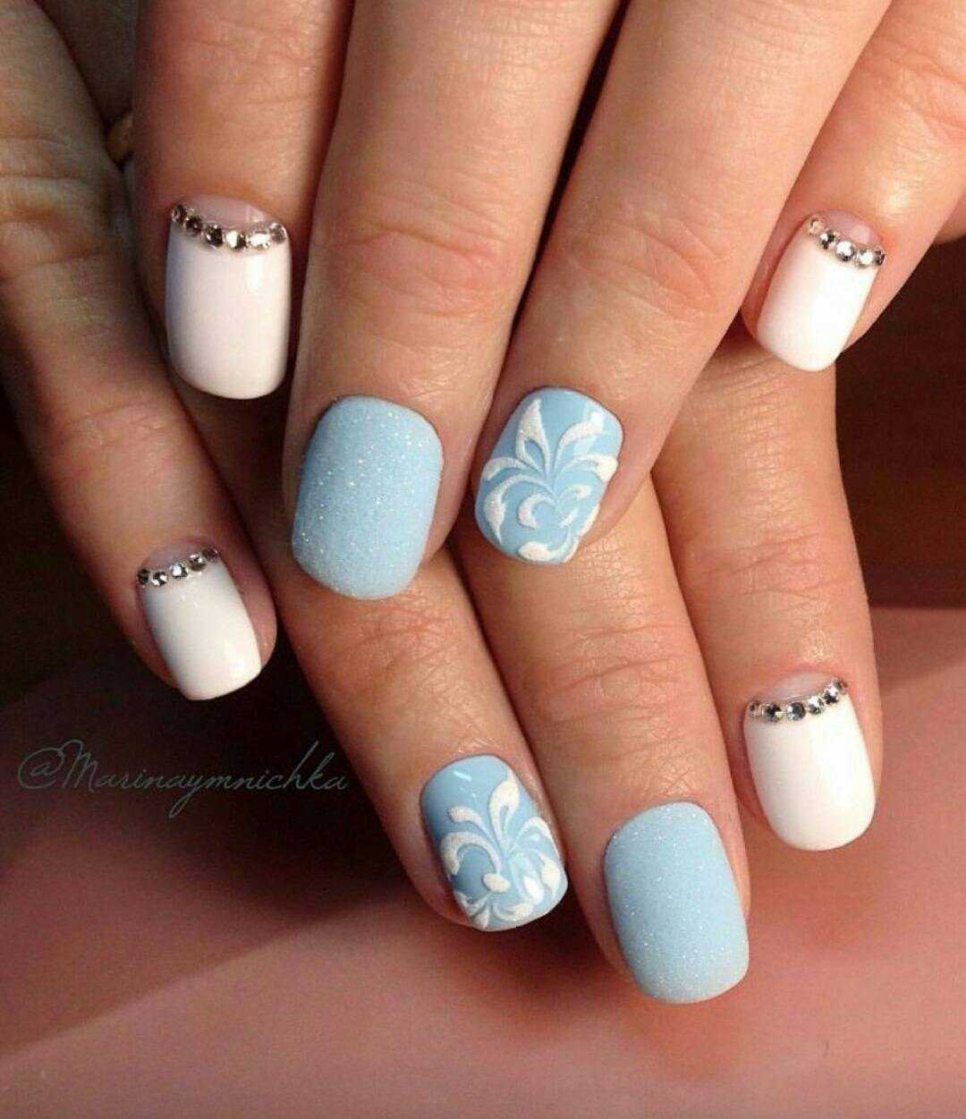 Кроме того белый и голубой часто используют для градиентного маникюра, который потом дополняется цветочным, ажурным или геометрическим декором. Белый цвет также используют для маникюра с лепкой и другим объемным декором.