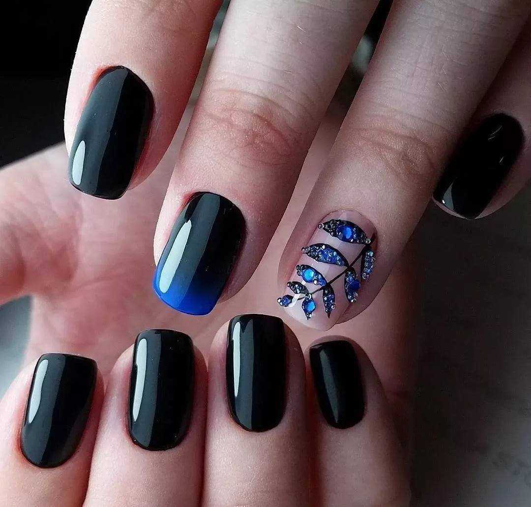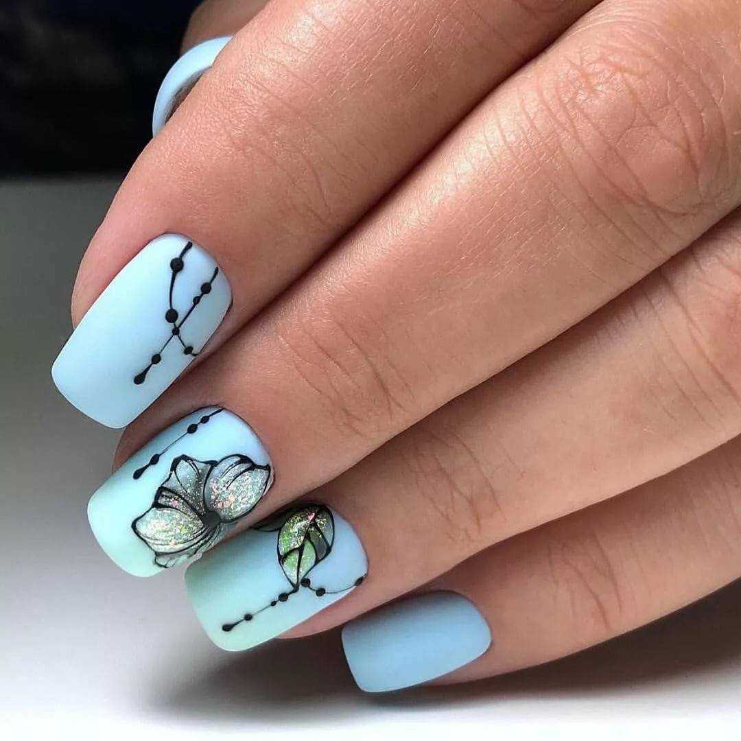 Несмотря на кардинальные отличия этих оттенков, голубой и черный весьма гармонично смотрятся в одном нейл-арте. Для дизайна чаще всего используются светло-голубые оттенки, которые на черном фоне будут смотреться еще ярче и насыщеннее.
