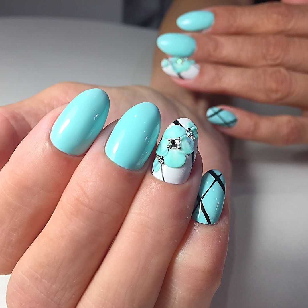 Бирюза насыщена светлым оттенком. Такой дизайн чаще всего выбирают девушки, которые привыкли вести активный образ жизни. Длина ногтей может быть короткой или длинной. Форма не имеет значения. Бирюзовый маникюр редко делают простым, его обычно дополняют стразами или бусинками.