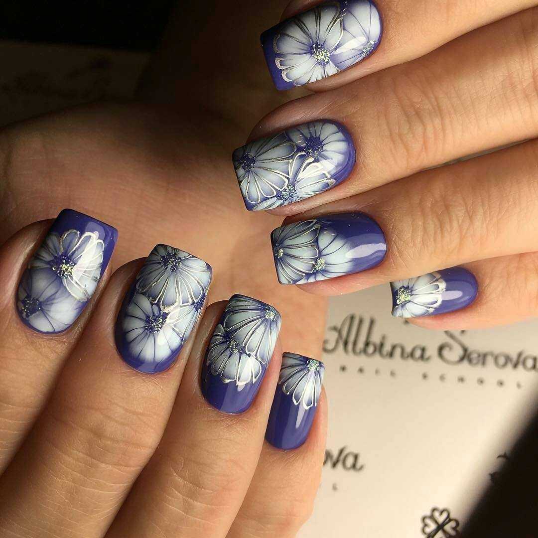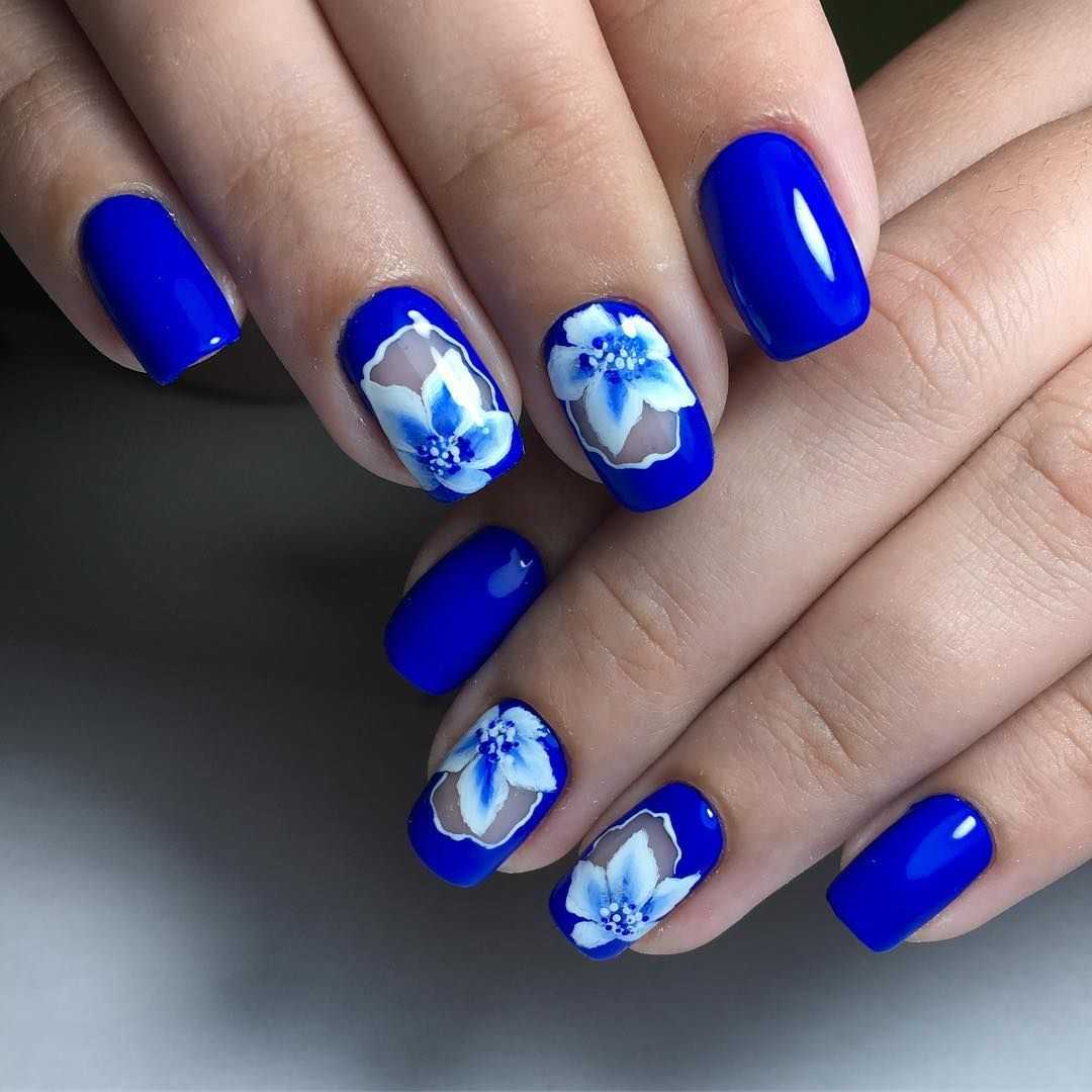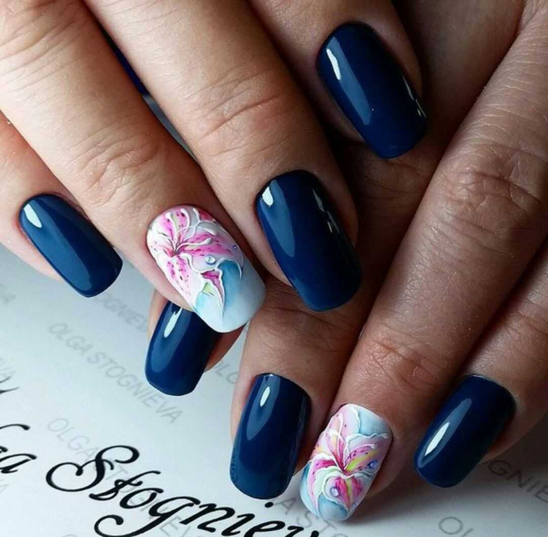 Оттенок синего признан самой подходящей основой для маникюра, на которую можно нанести цветы. Здесь можно использовать любую технику. Если вы выбрали синий цветок, лучшие оттенки для основы — белый, бежевый и золотой.