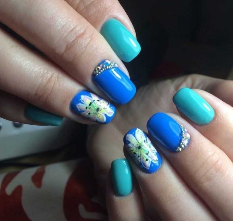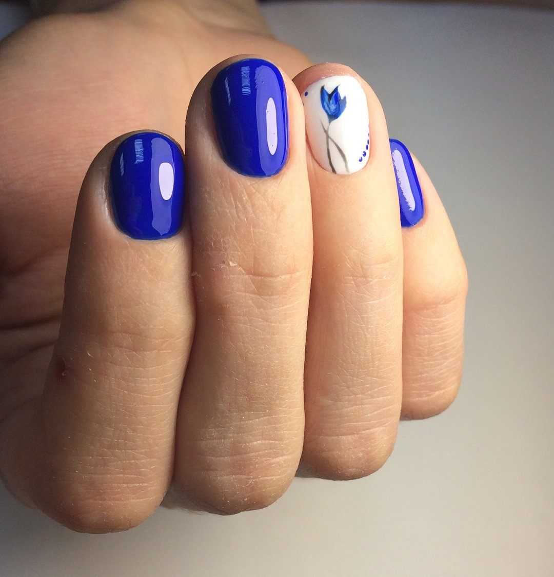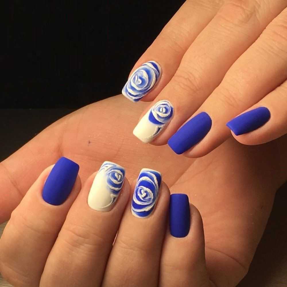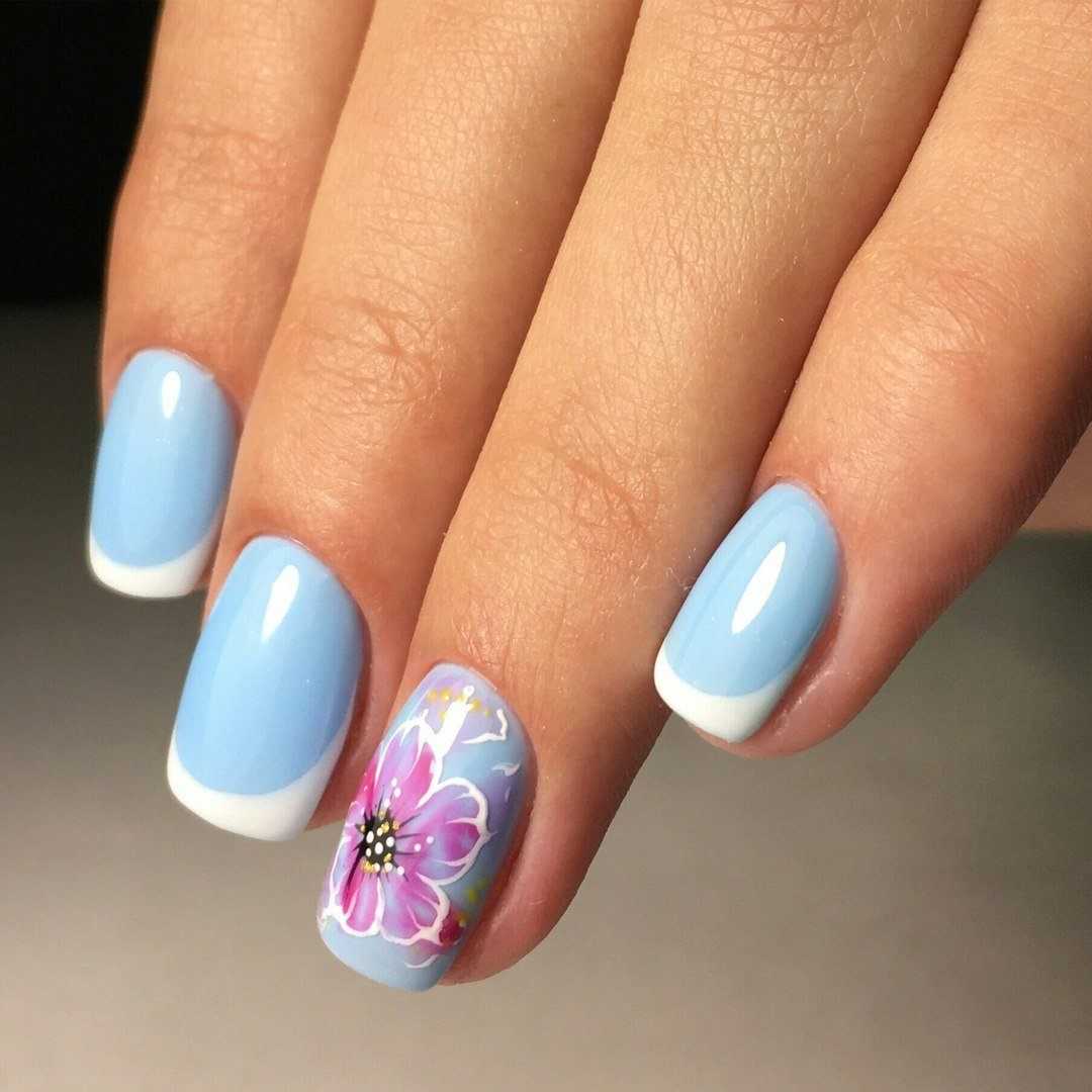 Оттенок синего признан самой подходящей основой для маникюра, на которую можно нанести цветы. Здесь можно использовать любую технику. Если вы выбрали синий цветок, лучшие оттенки для основы — белый, бежевый и золотой.