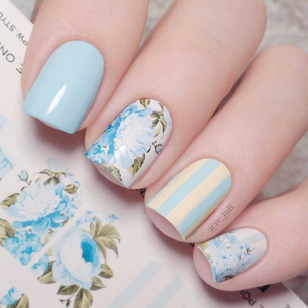 Голубые цветы отлично смотрятся на любом светлом фоне. И это не только белый, с голубым цветом можно использовать кремовый, серый, полупрозрачный розовый оттенки. Флористика в голубой цвете – это пример нежного и воздушного узора, который без сомнений станет отличным дополнением вашего дизайна ногтей.