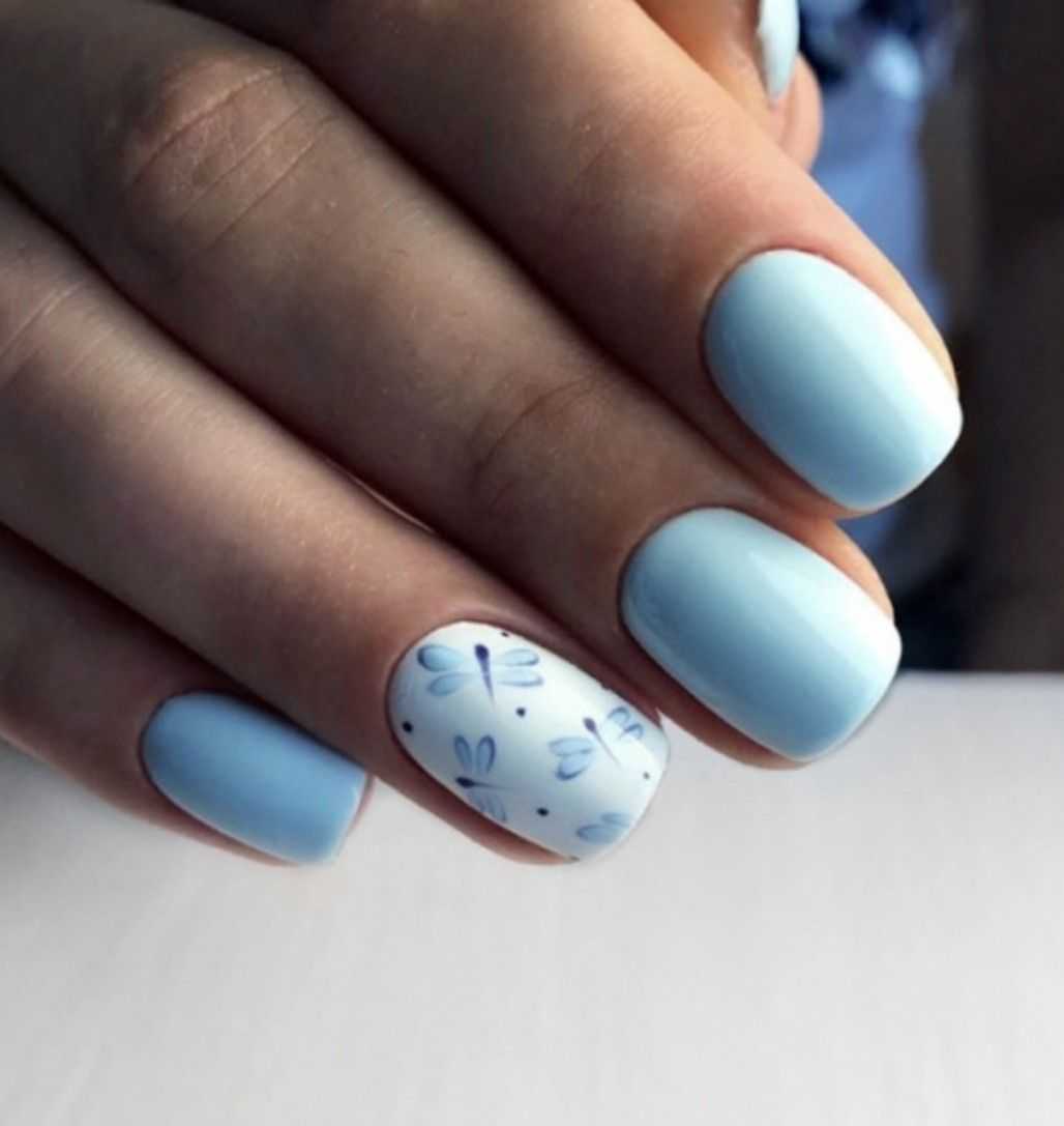 Пастельные матовые фактуры по-прежнему актуальны в 2023 году. Нежно-голубой маникюр – это своего рода классика. Этот вариант особенно подходит на короткие квадратные ногти. Девушки часто выбирают нежные оттенки синего весной и летом.