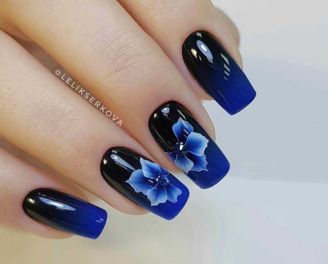 Что касается самого узора, то это могут быть абстрактные голубые цветы, розы, пионы и т.д. Располагать их лучше на 1-2 пальцах руки, чтобы дизайн не смотрелся слишком сложно. Для выполнения узора чаще всего используется ручная роспись. Так дизайн получается гораздо эффектнее и благороднее. Стемпинг в таком дизайне лучше не применять. На черном фоне наклейка будет заметна и вряд ли передаст красоту цветочного узора.