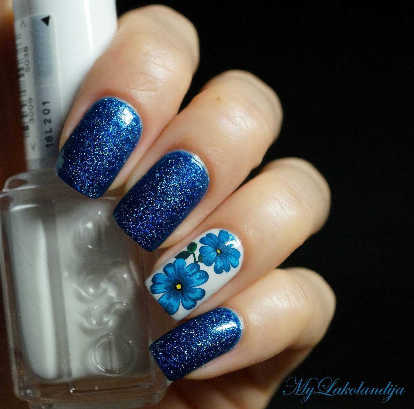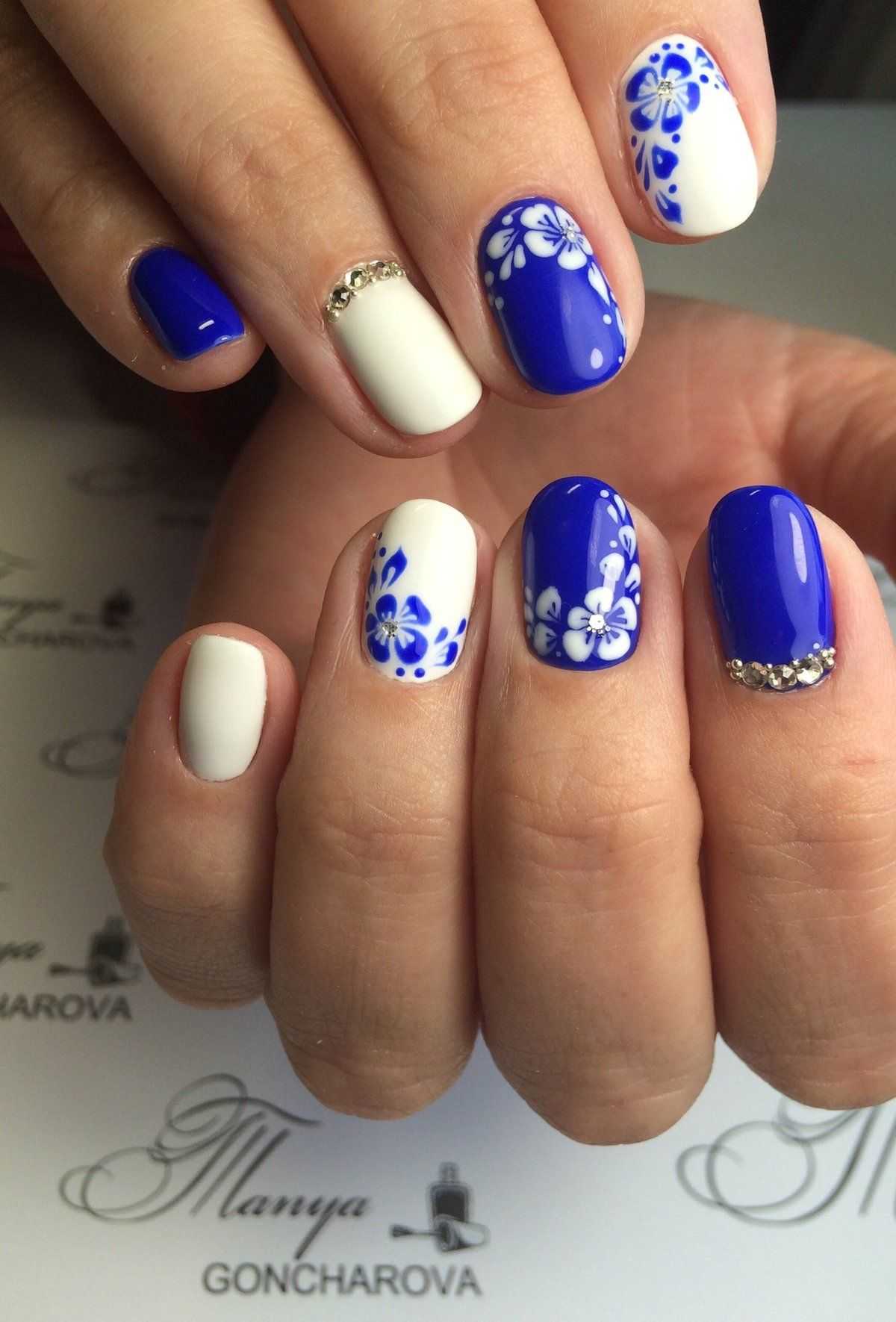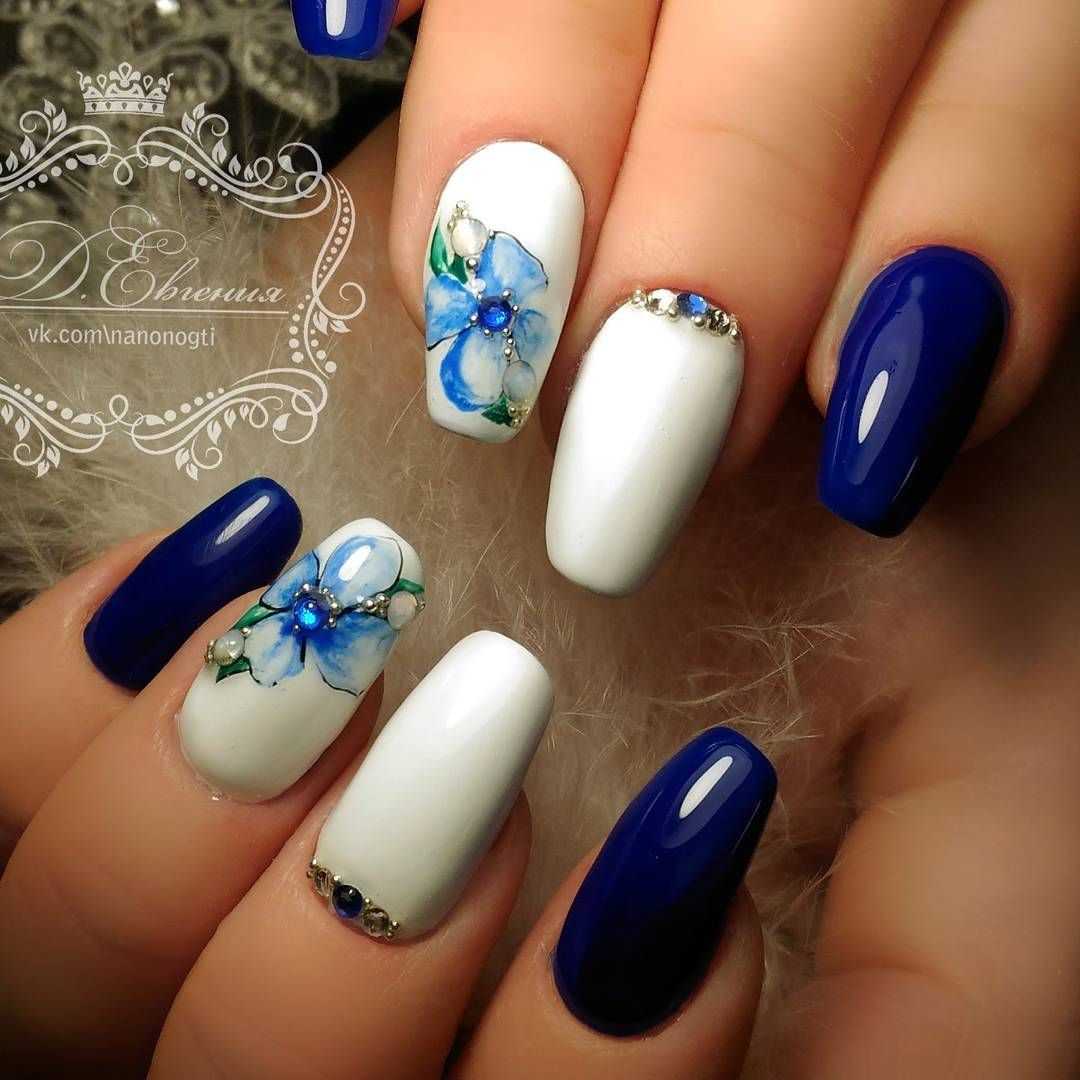 Сине-белый маникюр с рисунками. Самым разнообразным и красивым считается дизайн с узорами или рисунками. В этом случае основой может выступать как белый, так и синий лак. Популярными рисунками считаются цветочные абстракции и необычные завитки. Стилисты дополняют подобный дизайн блестками, пудрой, глиттером.