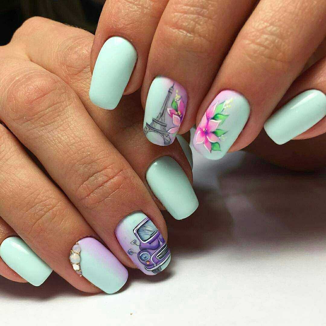Пёстрые, кислотные и радостные оттенки также имеют популярность среди летнего маникюра, особенно голубой или бирюзовый. Для осеннего либо зимнего периода лучше подбирать более тёмные оттенки.
