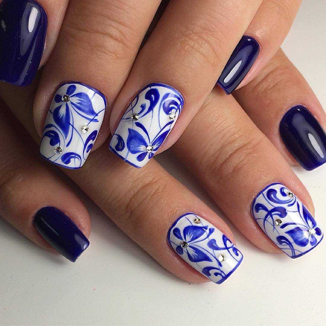 - Необычное решение дизайна ногтей в стиле «гжель». Яркие цветы на белом фоне, словно выведенные на керамике. Такая идея подойдет для свадебного наряда. Подобный дизайн является трендом летнего сезона.