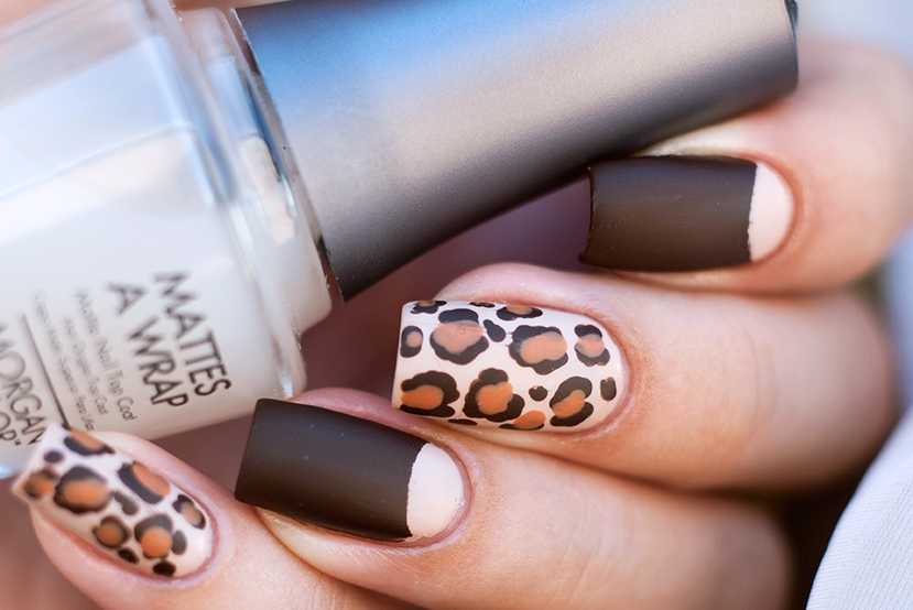 Очень красиво смотрятся матовые варианты маникюра с леопардовым рисунком различного вида.