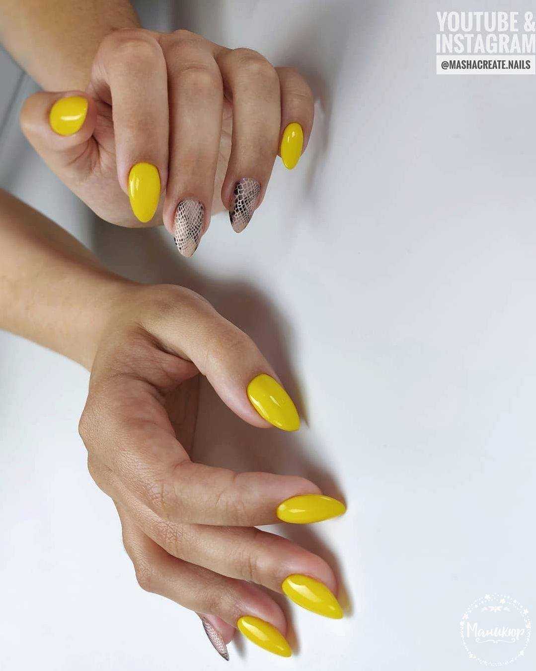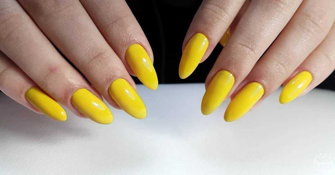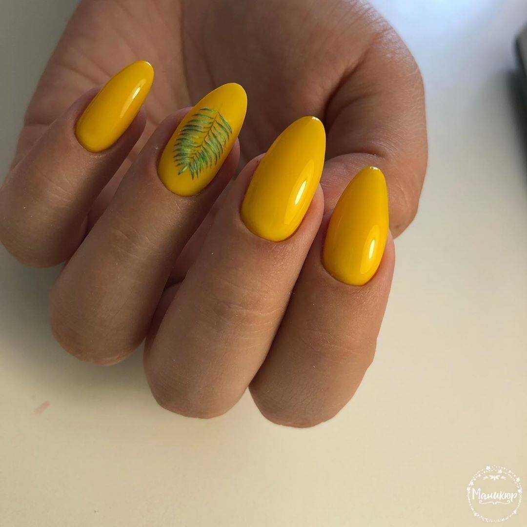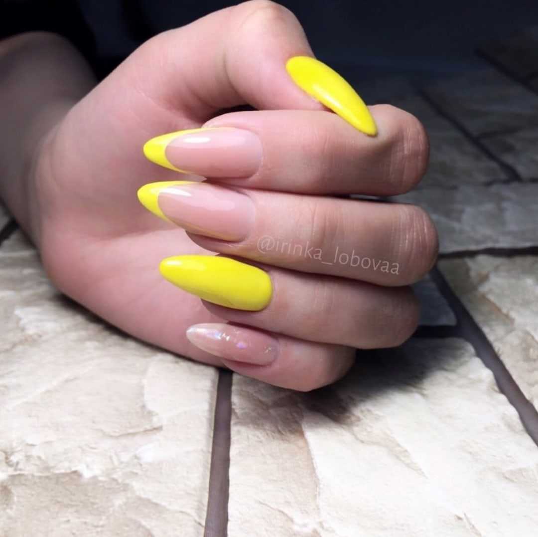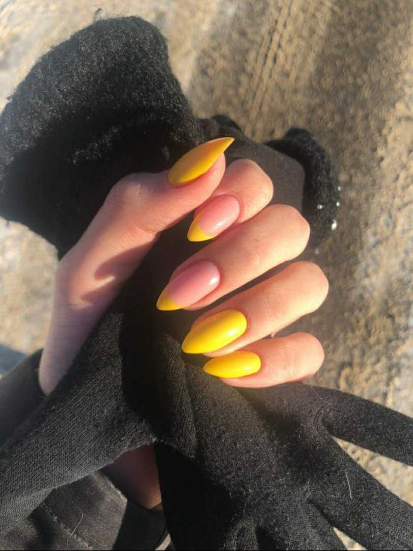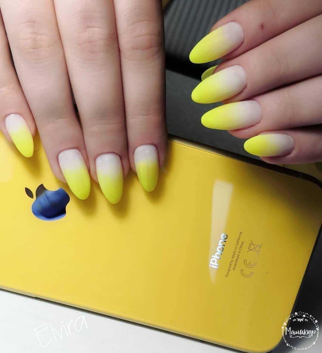 Эта форма ногтей позволяет обладательницам экспериментировать с дизайнами в трендовых тонах. Стильно смотрится градиент, причем переход можно делать в рамках одного оттенка желтого, просто меняя его насыщенность от бледного у основания ногтевого ложа к яркому краешку.