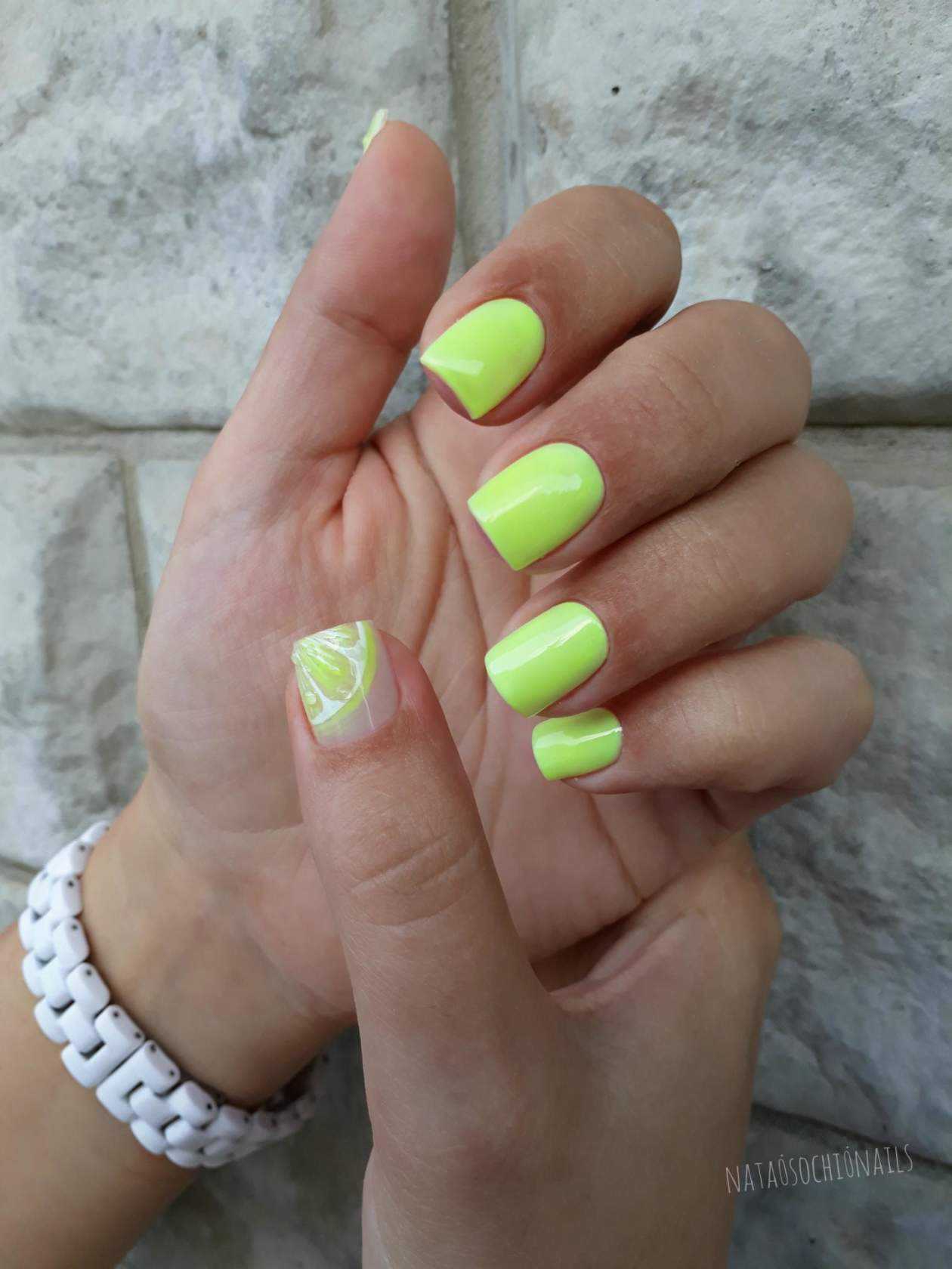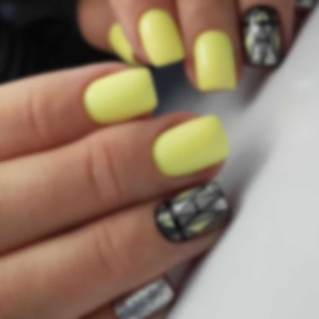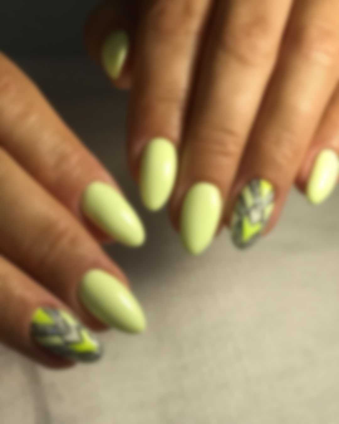 Пигменты позволяют создать на ногтях эффекты: зеркала, хрома, металлического мерцания. С лимонным, горчичным и неоновым одинаково эффектно смотрятся как полное покрытие пигментом, то есть нанесение его на поверхность всех ногтей, так и комбинированный вариант. На 1-2 ногтях на каждой руке мастер делает рисунки или другой декор, а остальные ногти покрываются пигментом.