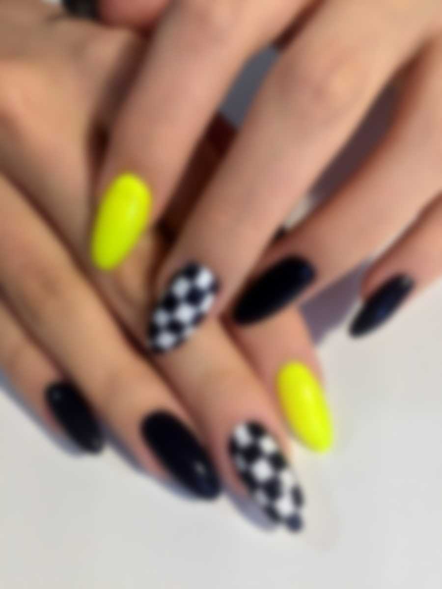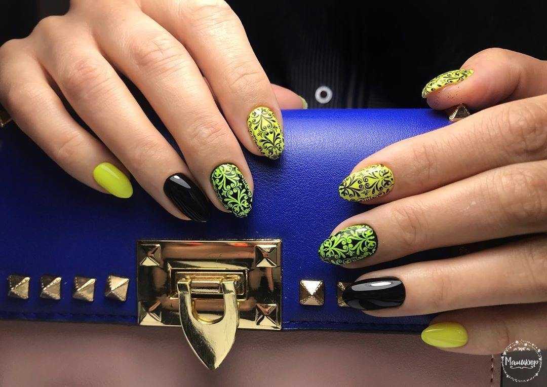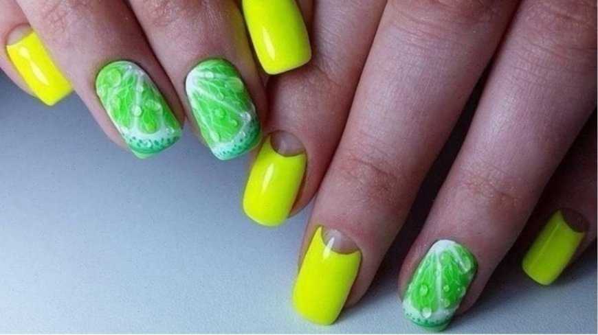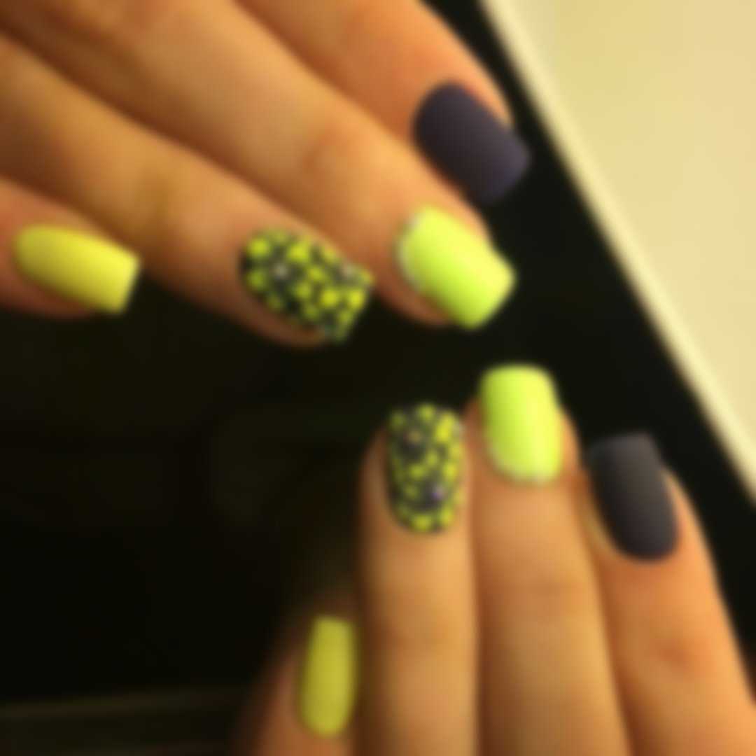 Пигменты позволяют создать на ногтях эффекты: зеркала, хрома, металлического мерцания. С лимонным, горчичным и неоновым одинаково эффектно смотрятся как полное покрытие пигментом, то есть нанесение его на поверхность всех ногтей, так и комбинированный вариант. На 1-2 ногтях на каждой руке мастер делает рисунки или другой декор, а остальные ногти покрываются пигментом.