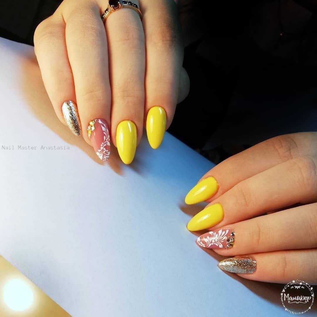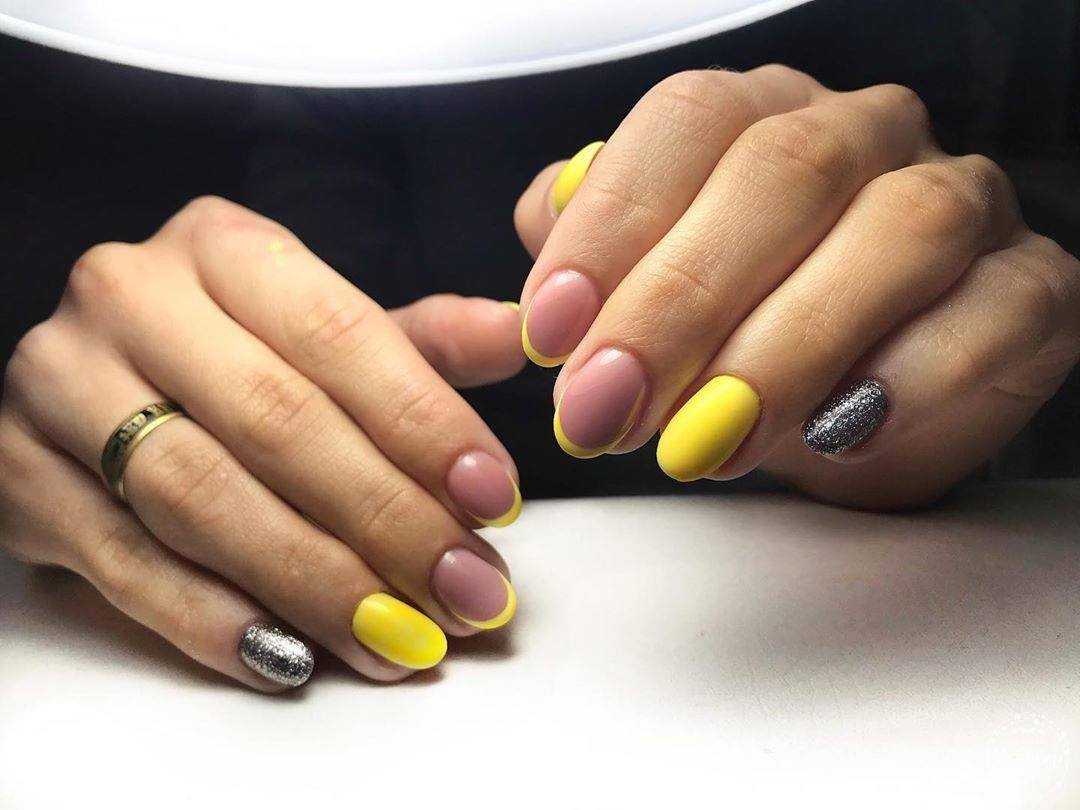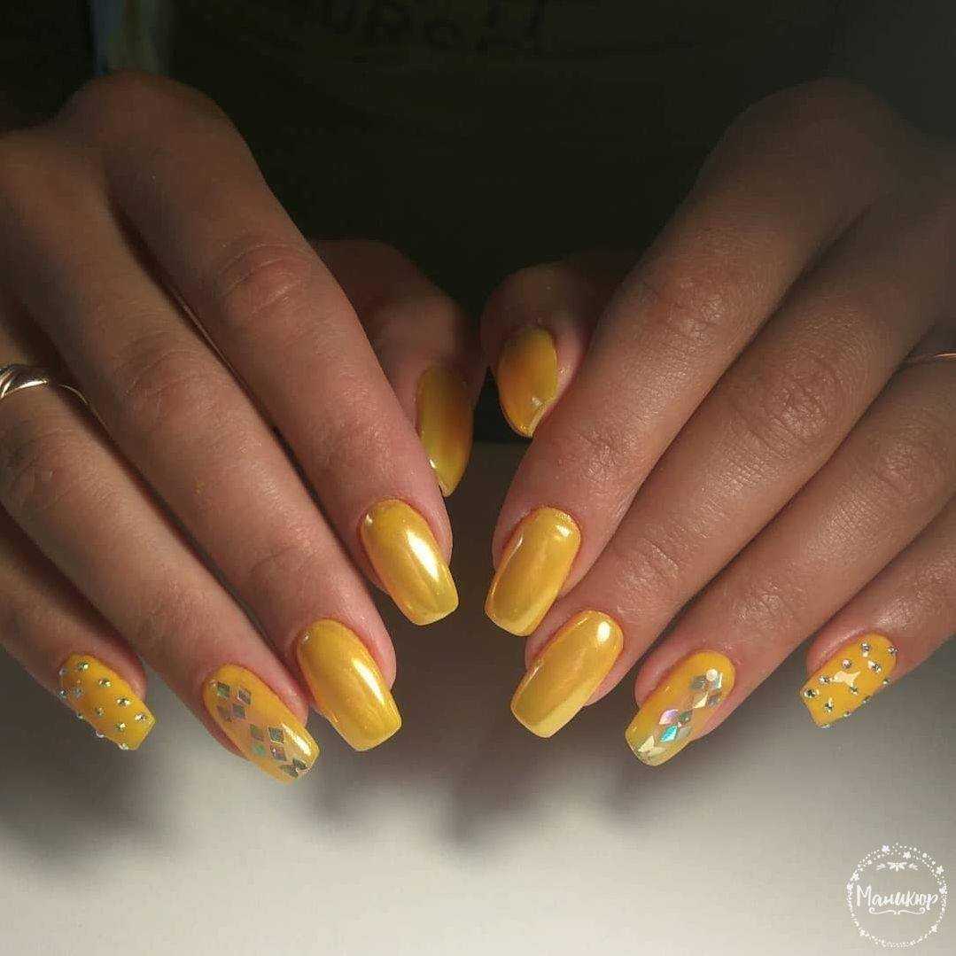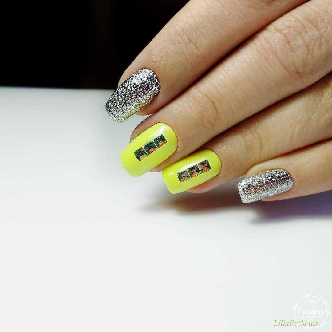 Желтый — один из цветов маникюра, который одинаково хорошо сочетается как с золотом, так и с серебром. Выбирая стразы или блестки, необходимо ориентироваться на оттенок покрытия ногтей. С яркими или горчичными тонами шикарно смотрится золото. Чем бледнее или холоднее оттенок, тем органичнее выглядит комбинация с серебром.