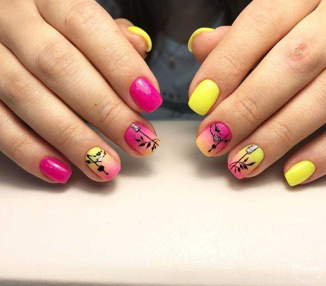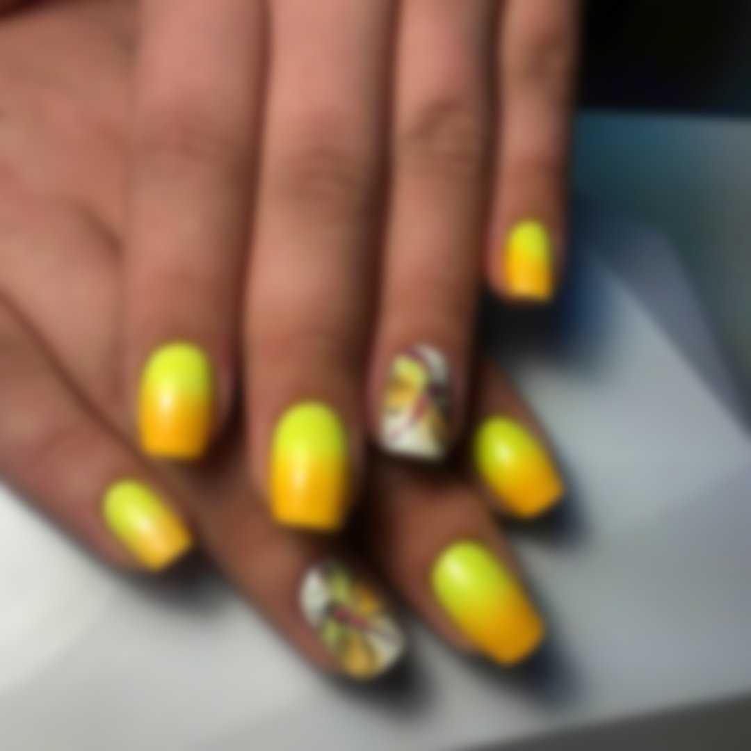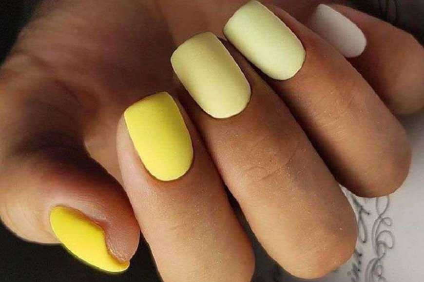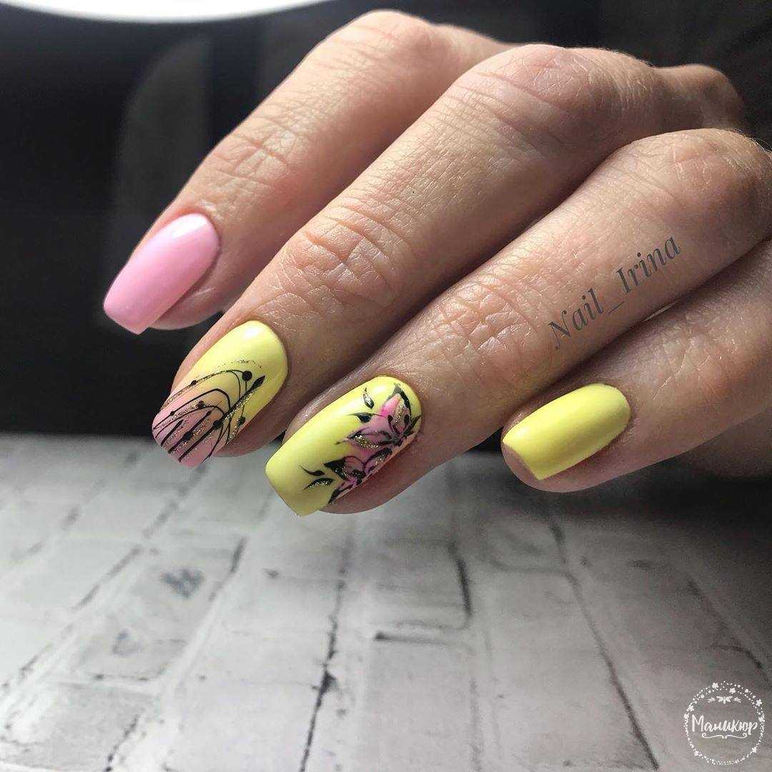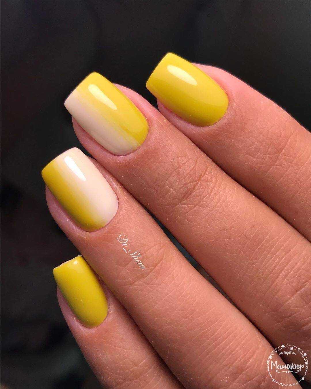 Нежно и романтично выглядит сочетание желтого с пастельными оттенками. Для выполнения плавного перехода в технике омбре можно использовать близкие или яркие контрастные оттенки.