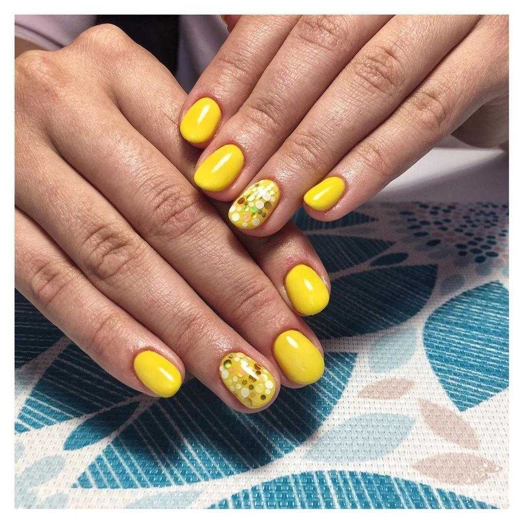 Великолепно дополнит эффектный вечерний образ яркий желтый маникюр, украшенный глиттером. Им можно декорировать один-два пальчика или покрывать все ноготки.