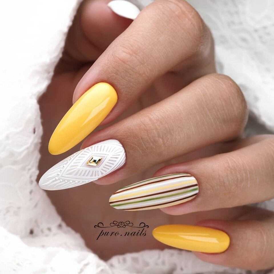 Очень освежает желтый маникюр добавление различных декоративных элементов. Фольга, блестки и стразы превращают обычный дизайн в торжественный.