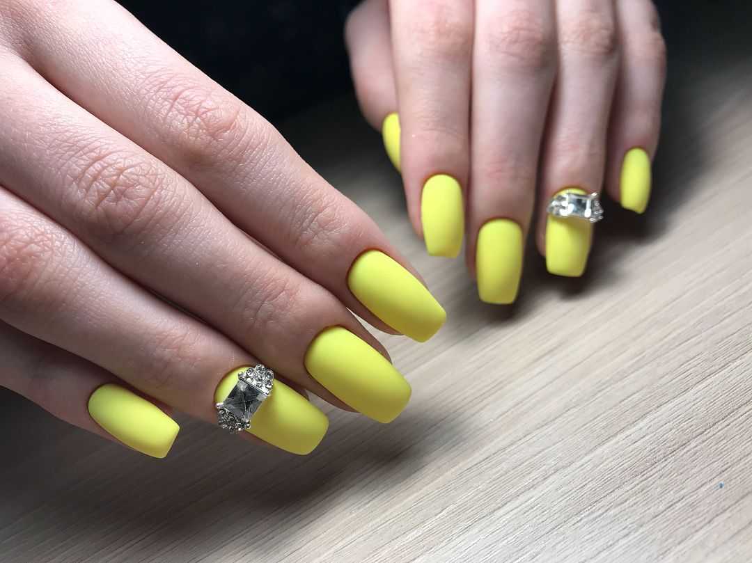 Желтый маникюр может выглядеть очень роскошно и торжественно при добавлении элементов декора. Стразы, камушки, втирки и фольга преобразят даже самый простой и скромный дизайн.