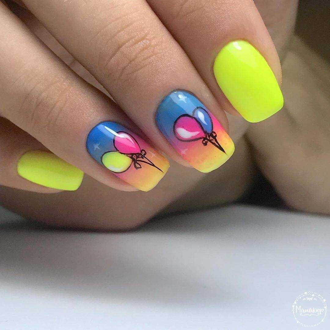 Для молодежного варианта нейл-арта мастера предлагают сочные фрукты, забавных животных, персонажей мультфильмов, комиксов. При этом возможны яркие сочетания: сиреневый с желтым, сине-желтый и другие. Прекрасно дополнят желтый цвет оттенки розового, голубого или салатового.
