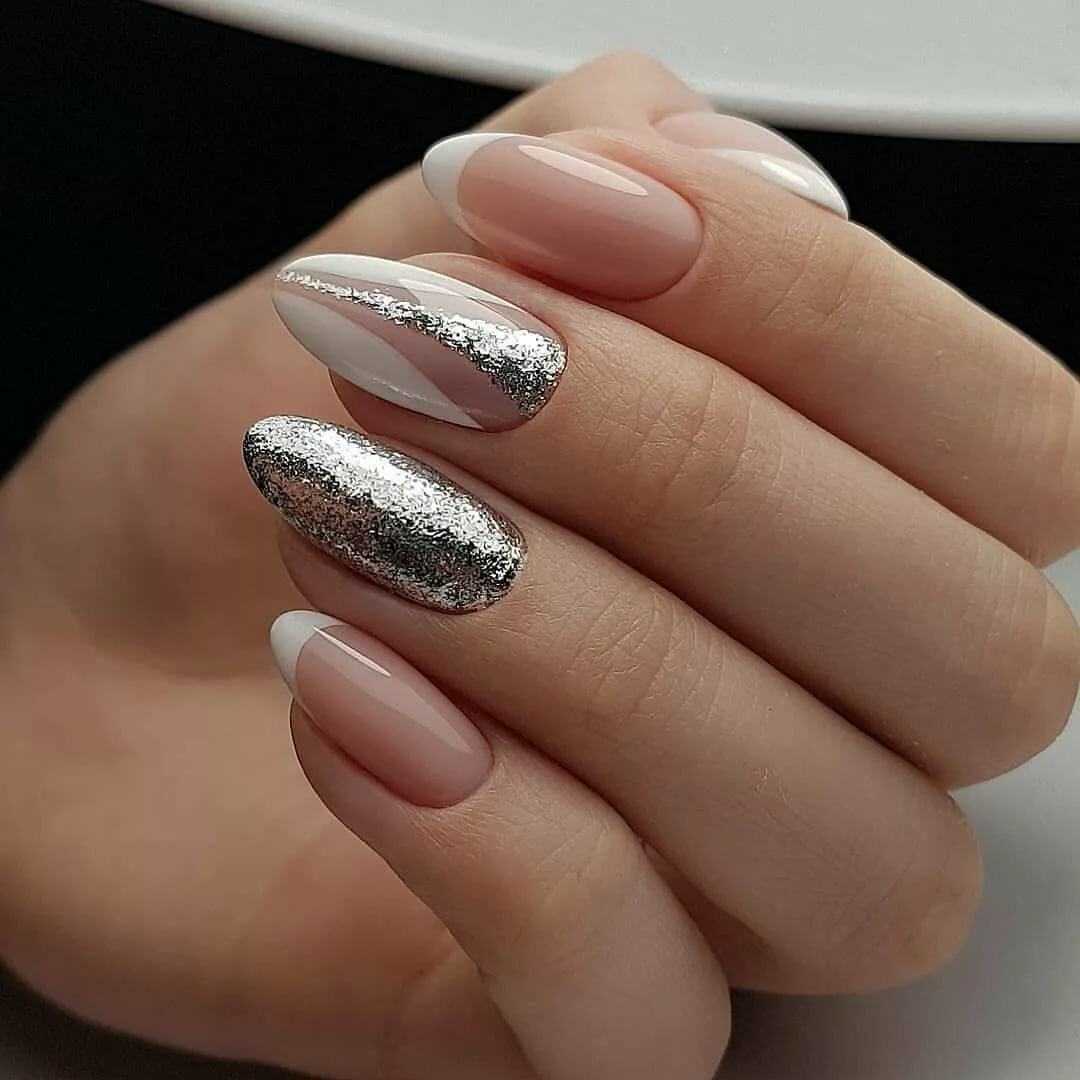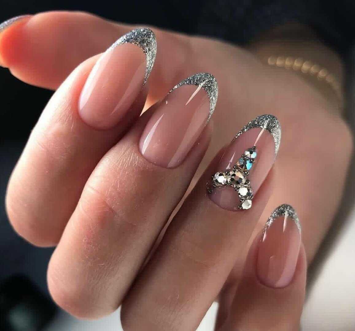 - френч с блестками — сияющие частицы можно заложить в основу или в финишное покрытие.
