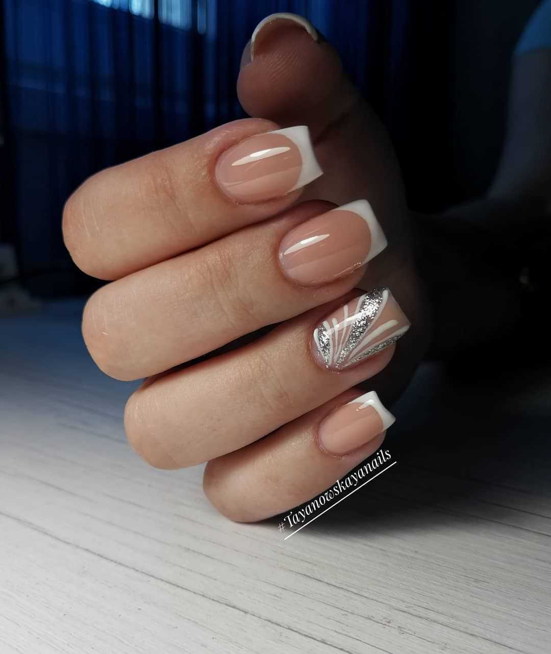 Многие девушки считают белый французский маникюр на коротких ноготках слишком консервативным. В таком случае можно немного пофантазировать и поэкспериментировать с дизайном. Например, можно нанести белый лак на сам ноготок, а улыбку сделать серебряной. Получится очень красивый маникюр.