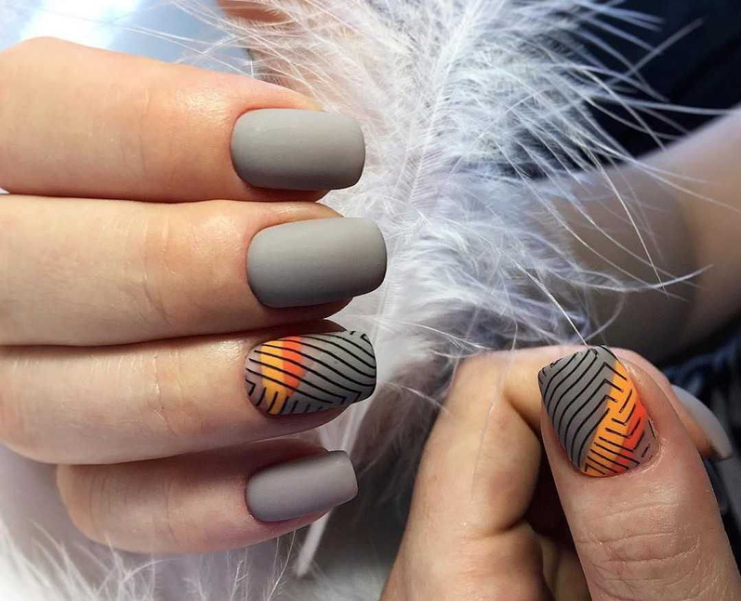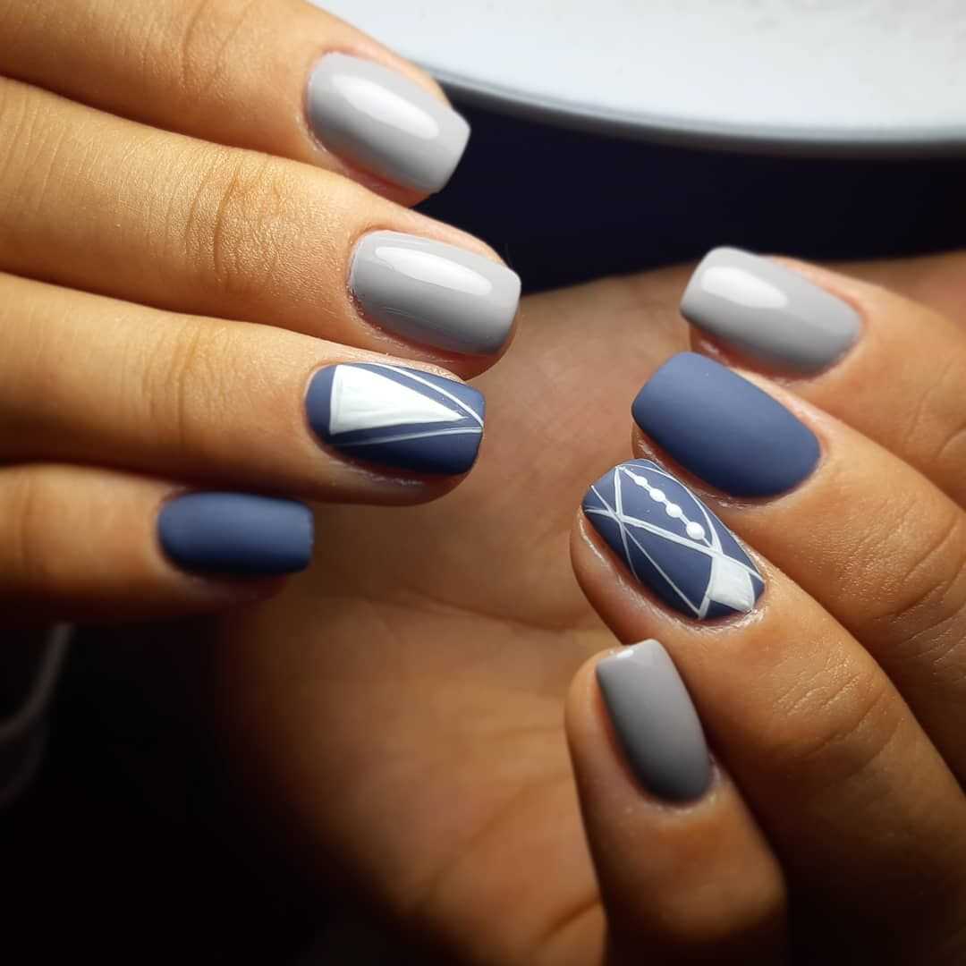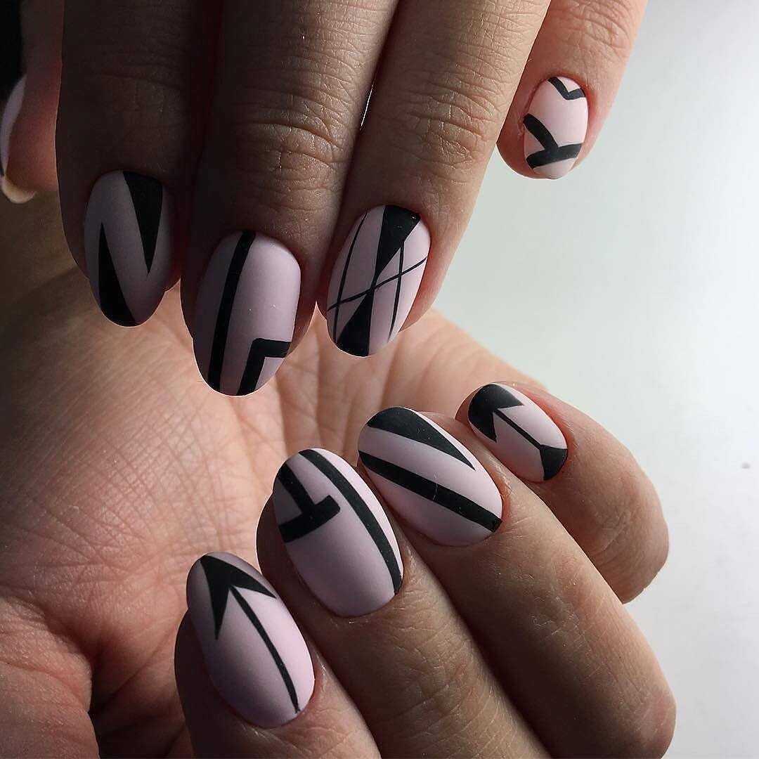 Орнамент в сочетании с матовым покрытием смотрится потрясающе. В зависимости от ваших предпочтений вы можете использовать любой. Современный, динамичный, городской стиль прекрасно дополнит геометрический рисунок. Строгие тонкие линии, точки на акцентом пальце, созданные контрастными красками будут отличной идеей для повседневного маникюра.