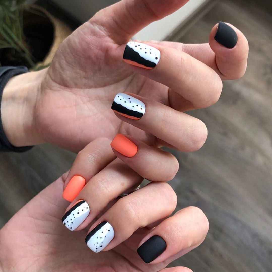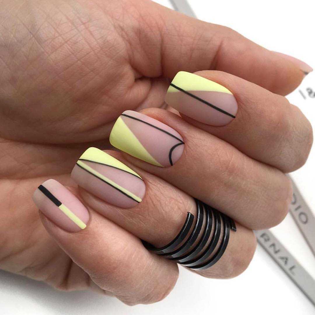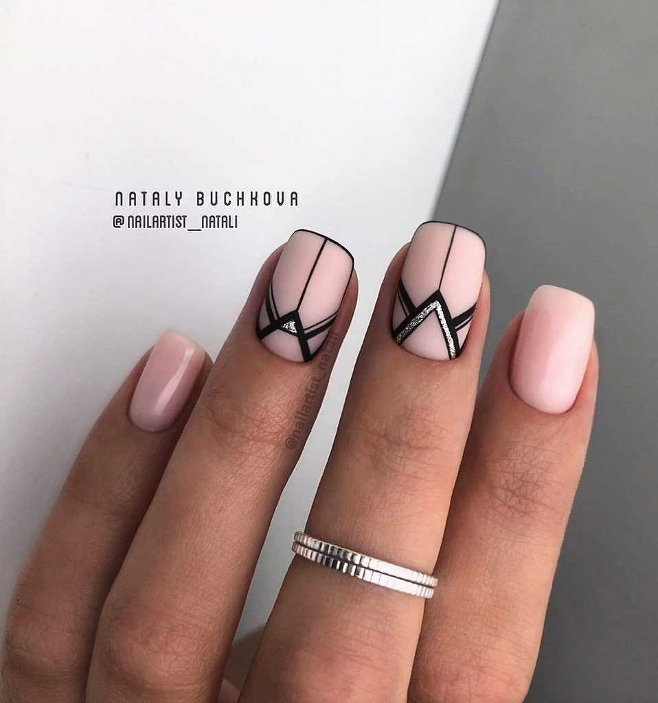 Орнамент в сочетании с матовым покрытием смотрится потрясающе. В зависимости от ваших предпочтений вы можете использовать любой. Современный, динамичный, городской стиль прекрасно дополнит геометрический рисунок. Строгие тонкие линии, точки на акцентом пальце, созданные контрастными красками будут отличной идеей для повседневного маникюра.