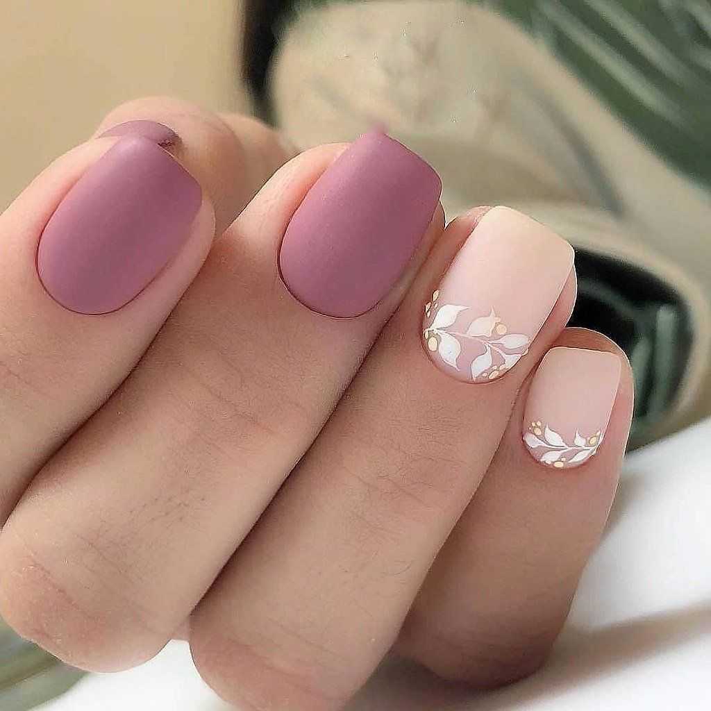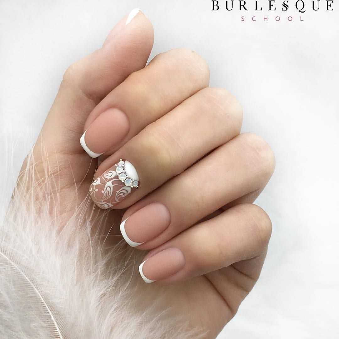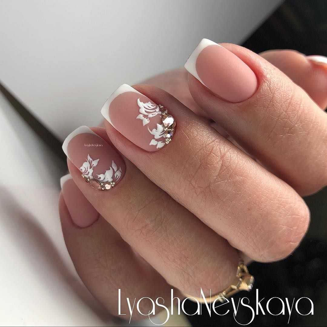 Женственный и нежный матовый маникюр в комбинации с кружевом или цветочным рисунком — лучший выбор для романтичных натур. Узоры выполняются разными способами: от сложной трудоемкой ручной росписи и стемпинга, до простых наклеек-слайдеров, которые смотрятся также очень эффектно.