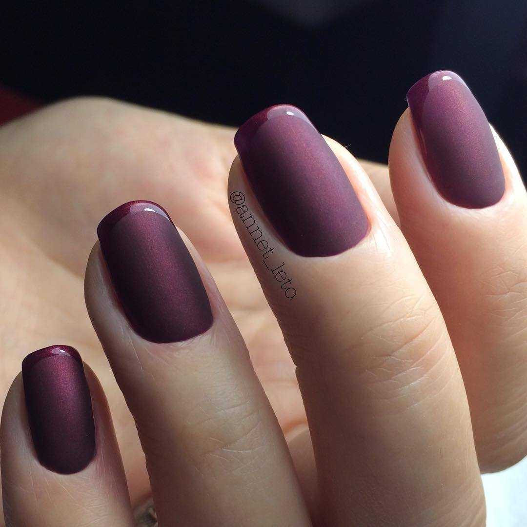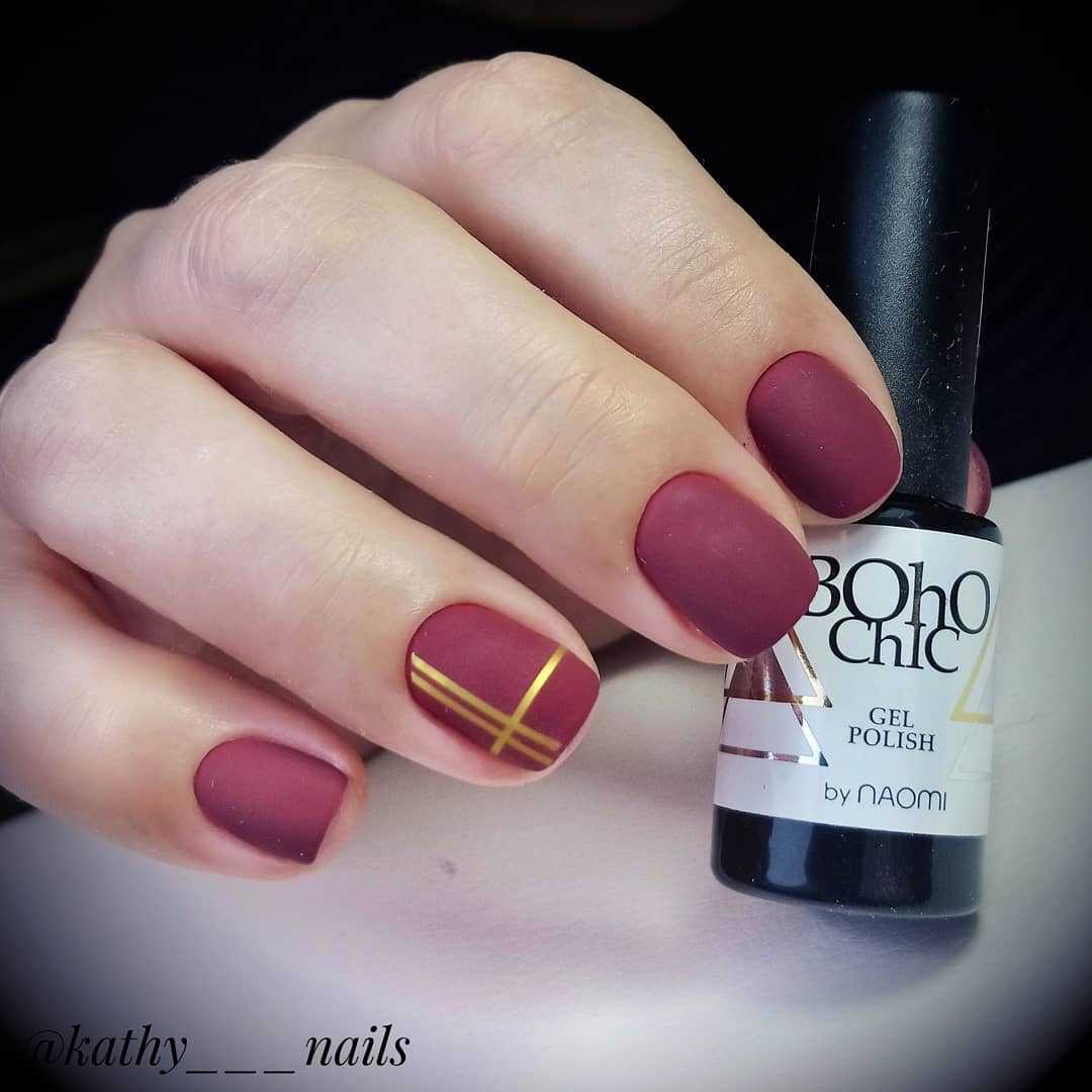 Выбирая бордовый матовый маникюр на коротких ногтях, стоит учитывать, что однотонное цвет сильно укоротит руки визуально и подчеркнет все недостатки пластины.