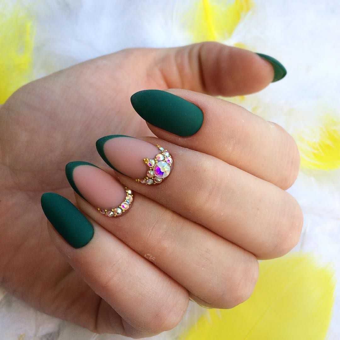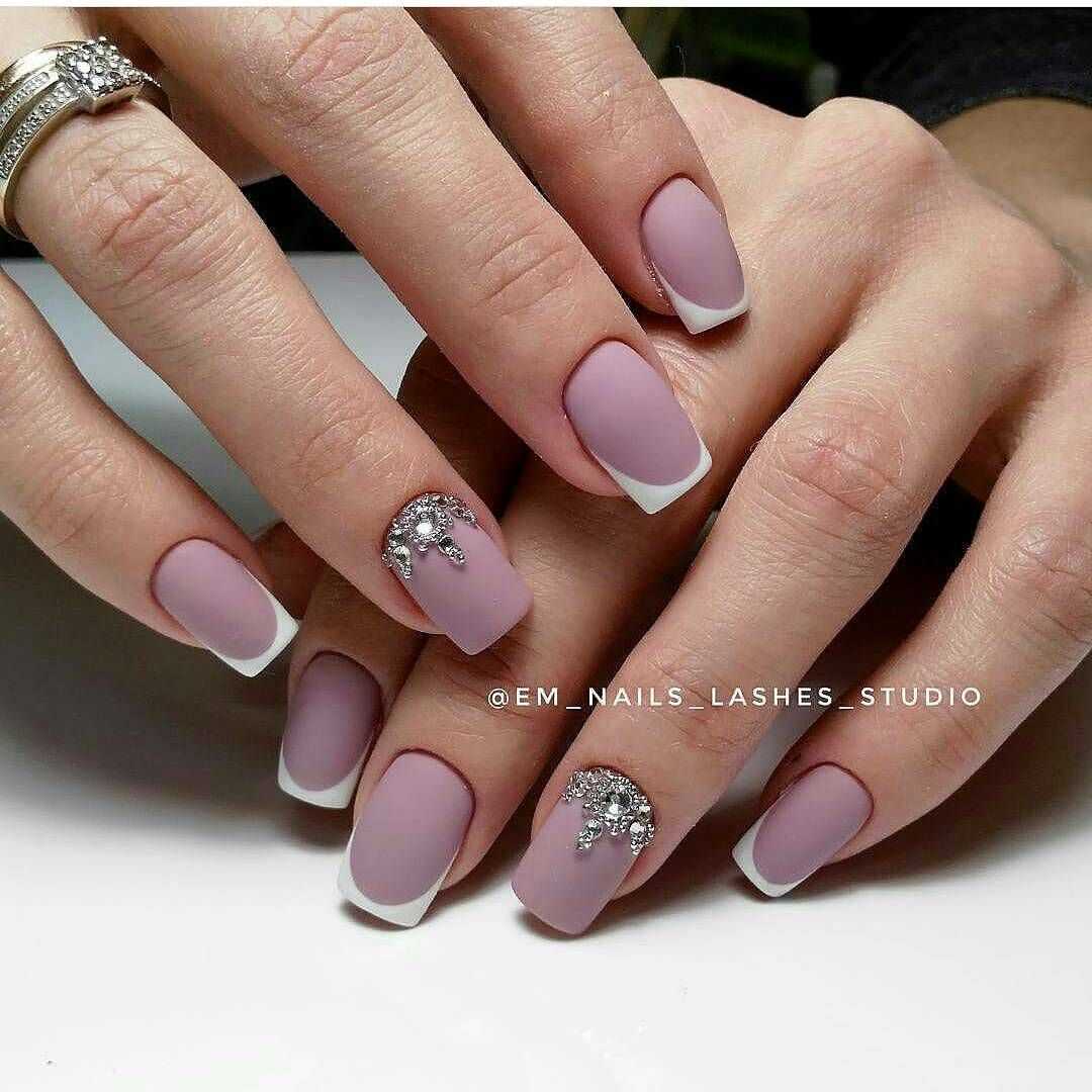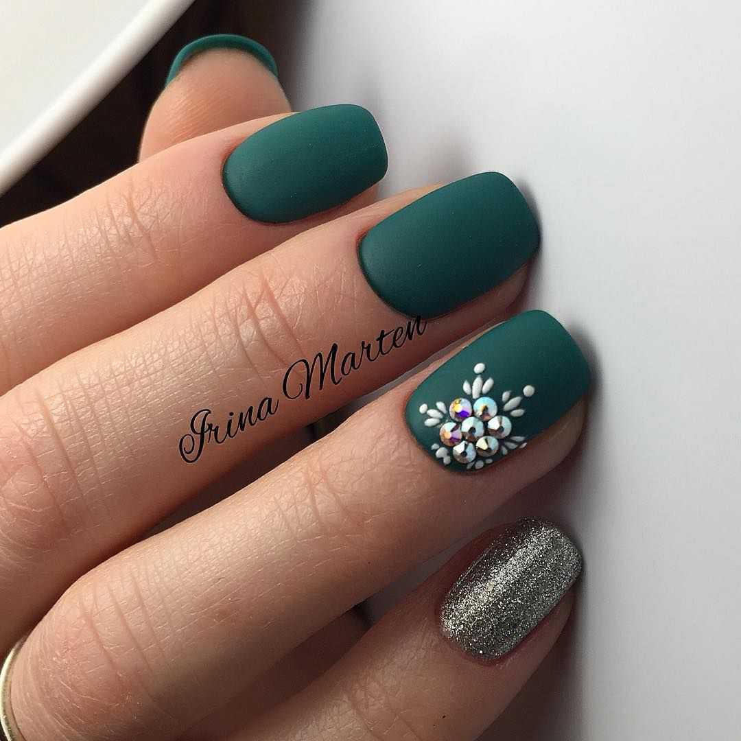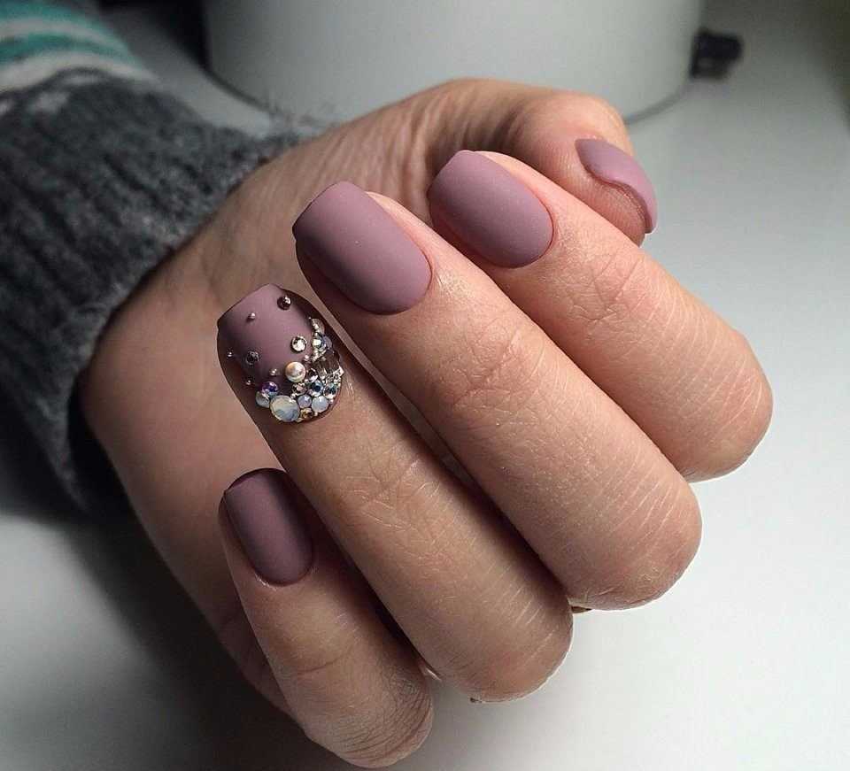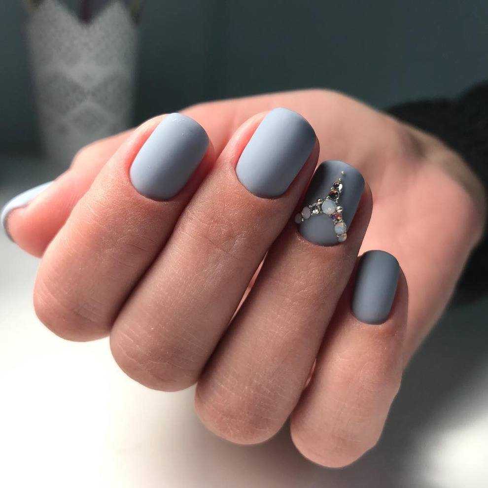 Декор со стразами, инкрустированными «под ювелирные украшения»—кольцо на пальце, один из популярных приемов на матовом фоне. Смотрится «дорого», но при этом минималистично и стильно.