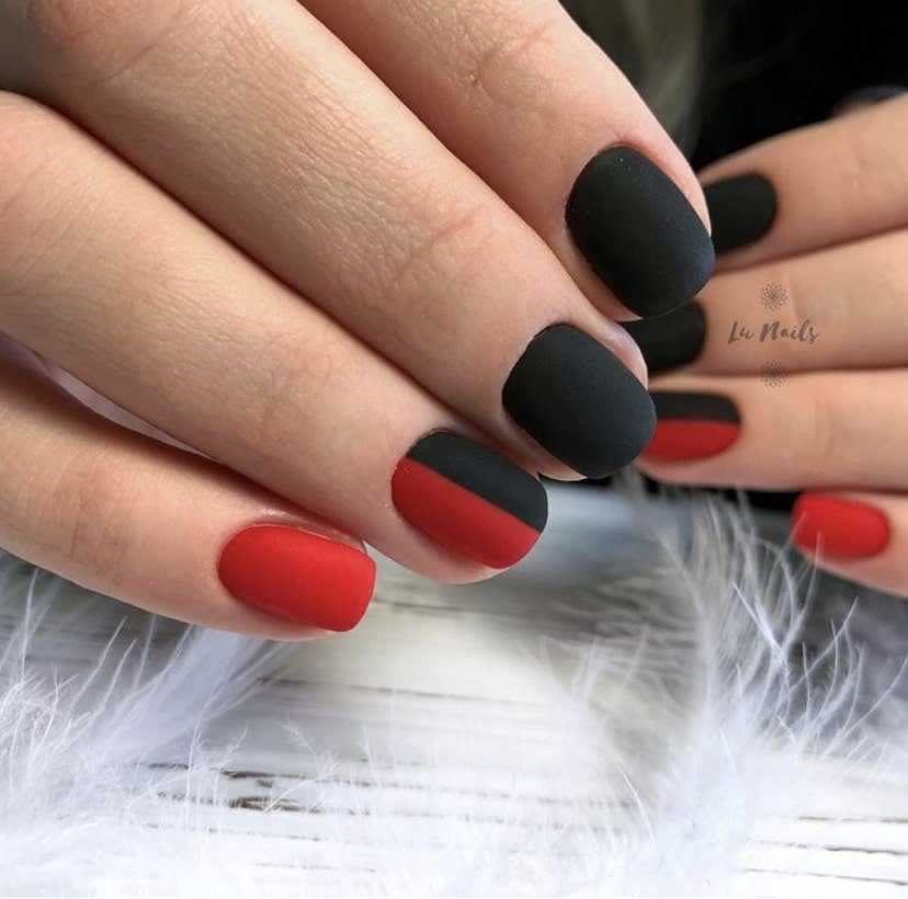 Темное с чёрным, как правило, не смешивают. Но черный бордовый матовый маникюр в сочетании с глянцем будет выглядеть просто потрясающее, в особенности с геометрическими узорами.