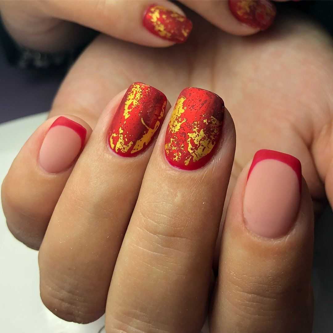 Потрясающее будут выглядеть в маникюре бордовые матовые ногти с золотой фольгой, либо блестками. Они создадут эффект «звездной» ночи или просто станут акцентным сочетанием.