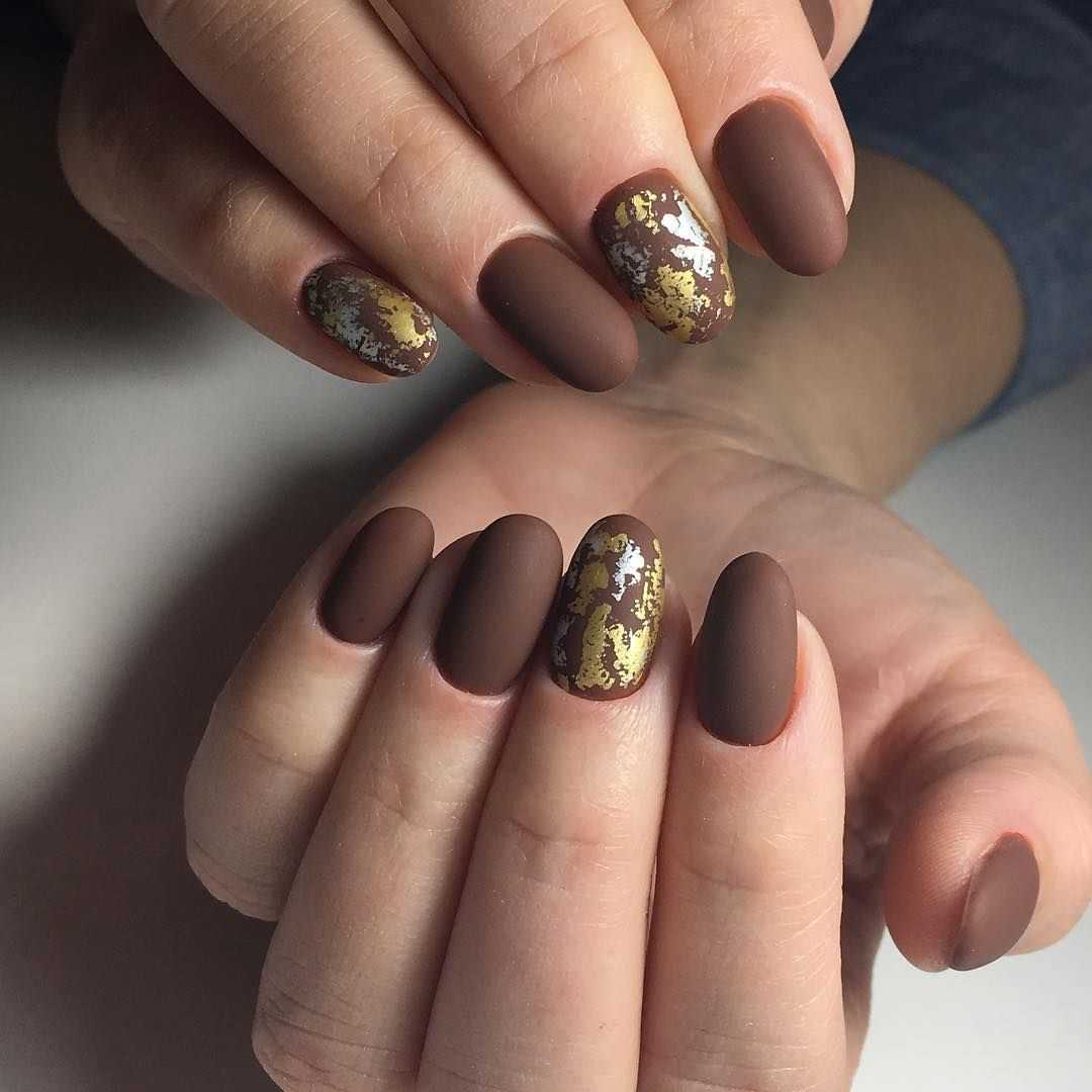 Элементы с золотом и серебром идеально смотрятся на матовом фоне. В основном узоры создаются фольгированным гелем (жидким глиттером), лентами, фольгой. Достаточно минимального акцента, для получения элегантного матового маникюра.