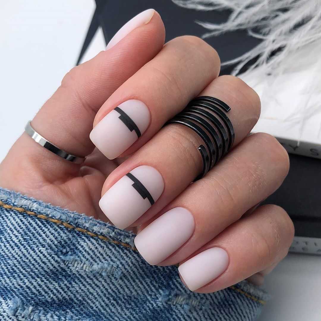 Матовый френч в современном исполнении с абстрактными геометрическими элементами смотрится очень креативно. Трансформация лунок в этом же стиле не менее интересна.