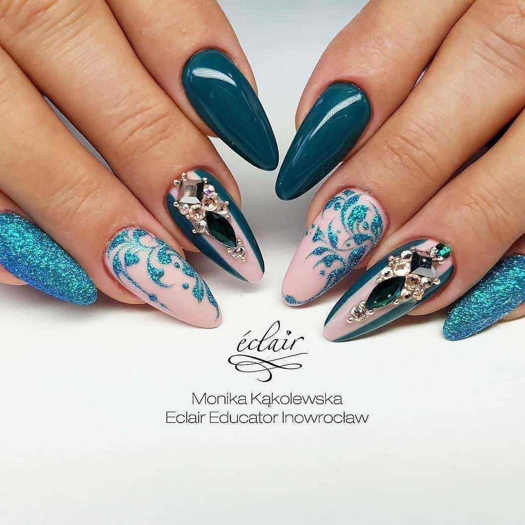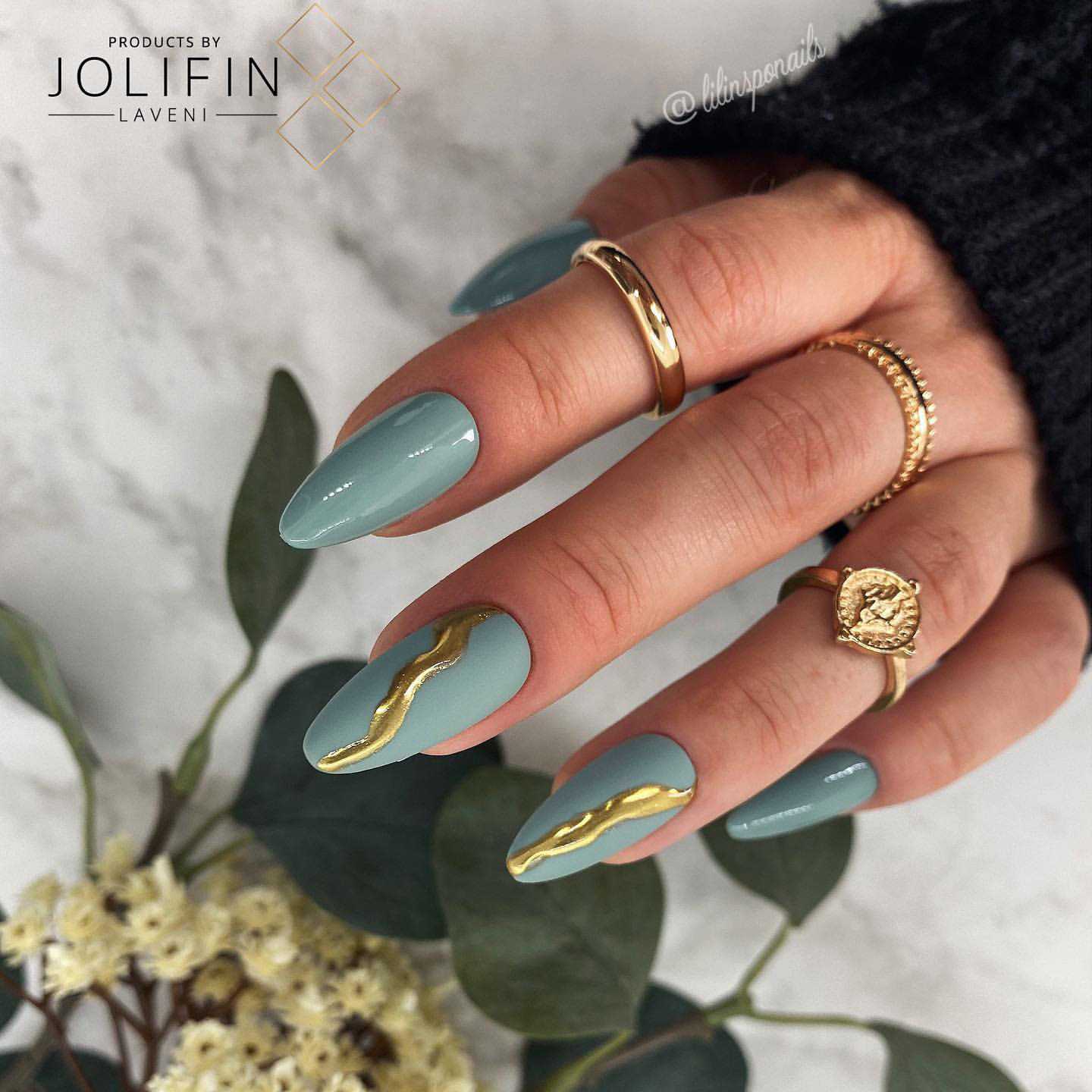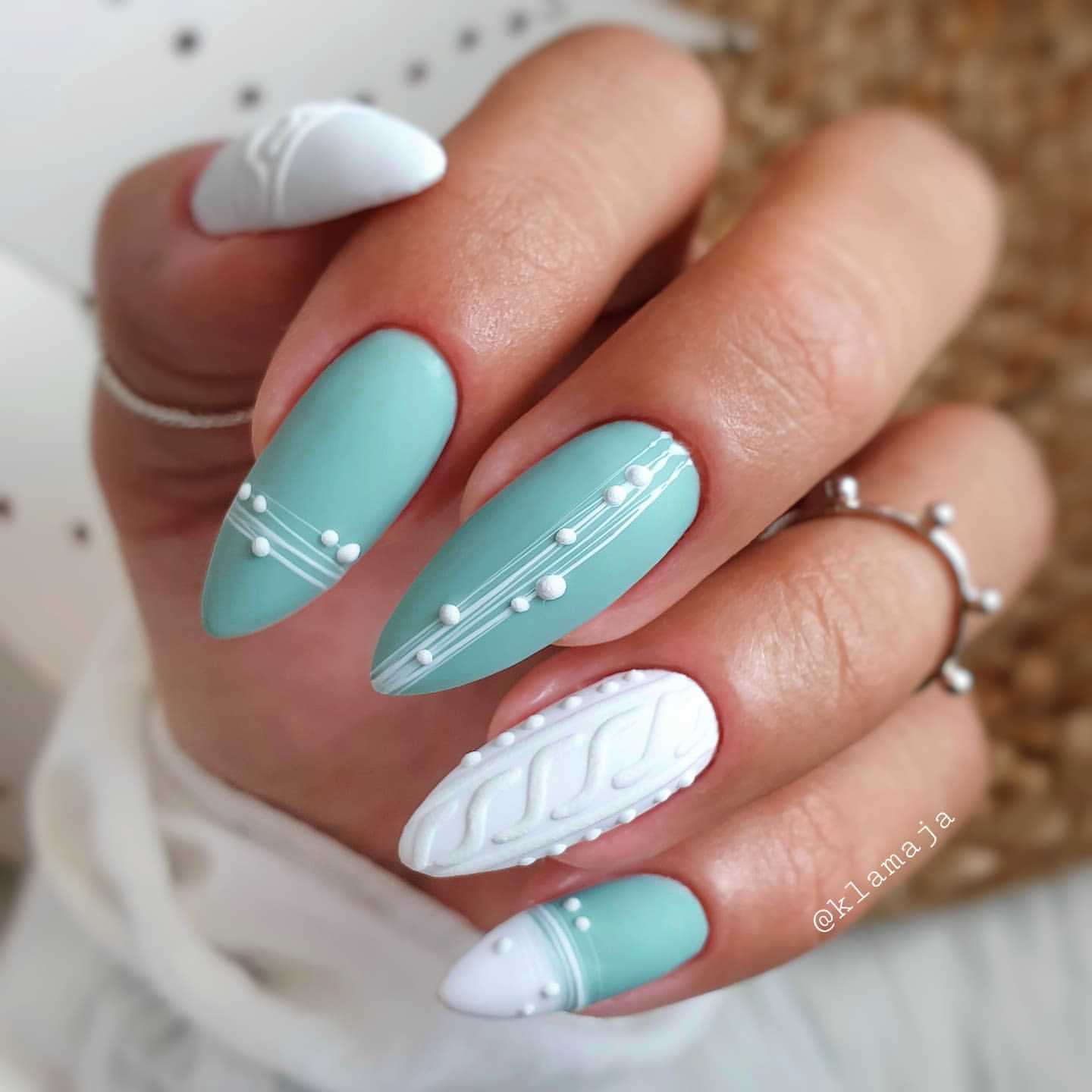 На мятном полотне есть где разгуляться, особенно, если у вас длинные ногти любой формы. Многогранный и свежий оттенок лака можно украсить в этом сезоне дизайном с: