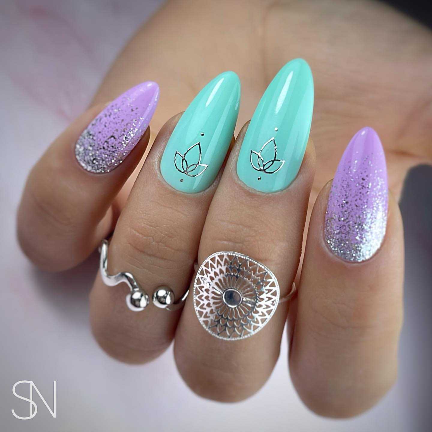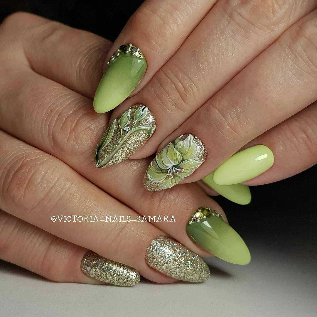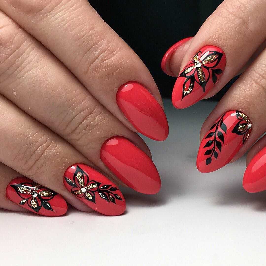 Самый востребованный орнамент независимо от сезонности — флористика. Рисунок с цветами, листьями, бутонами — прекрасно гармонируют с миндалевидной формой. Узоры наносятся как только на акцентные пальцы, так и паттернами — на все ноготки. Могут воспроизводиться ручной росписью (акварелью, техникой тату), стемпингом или же наклейками-слайдерами.
