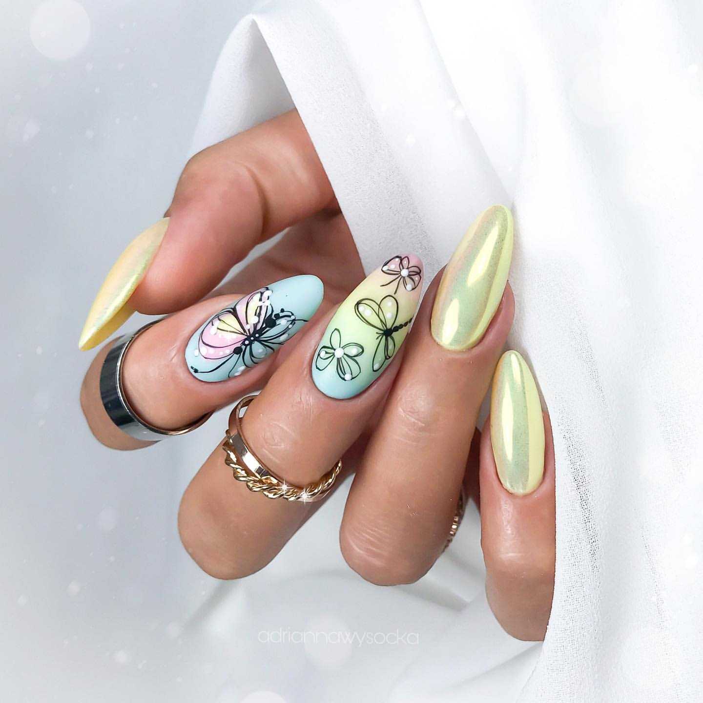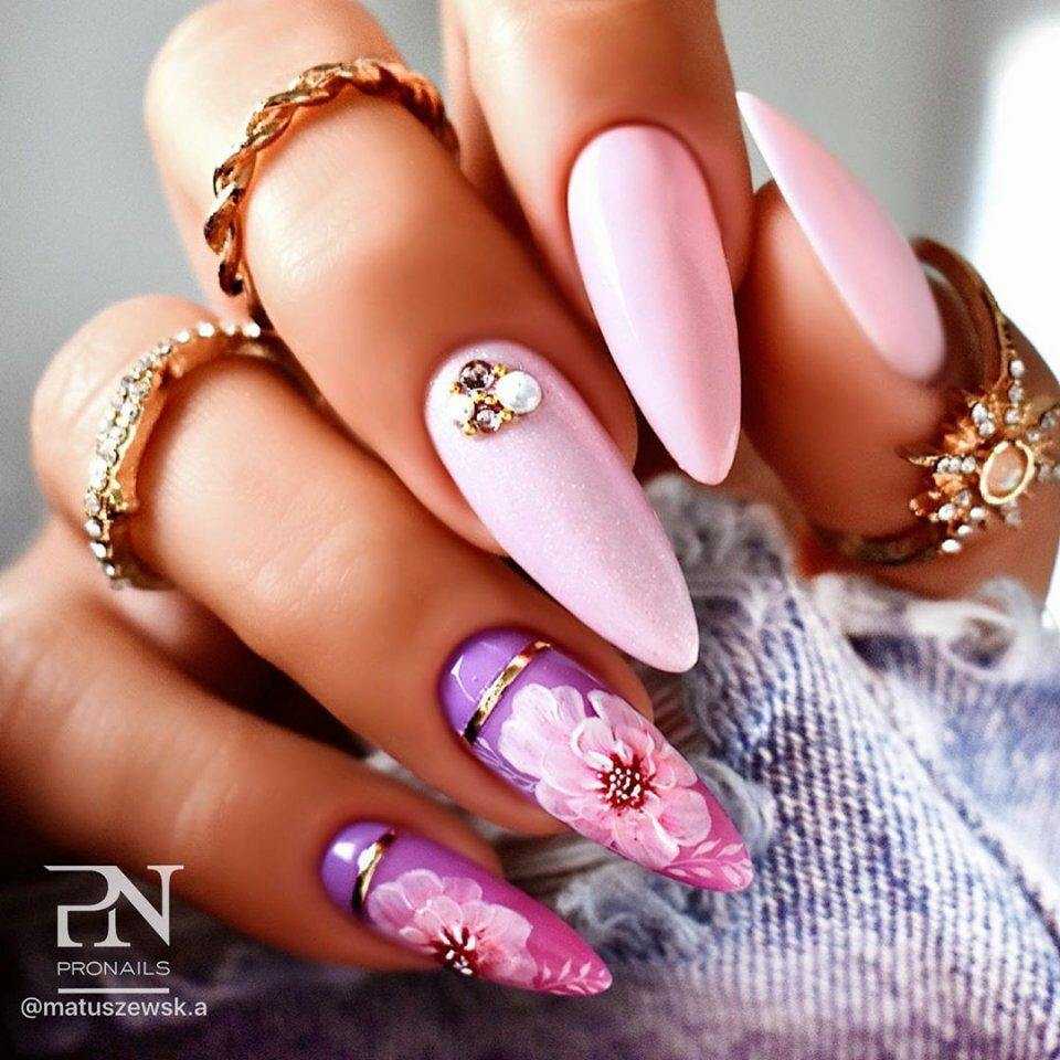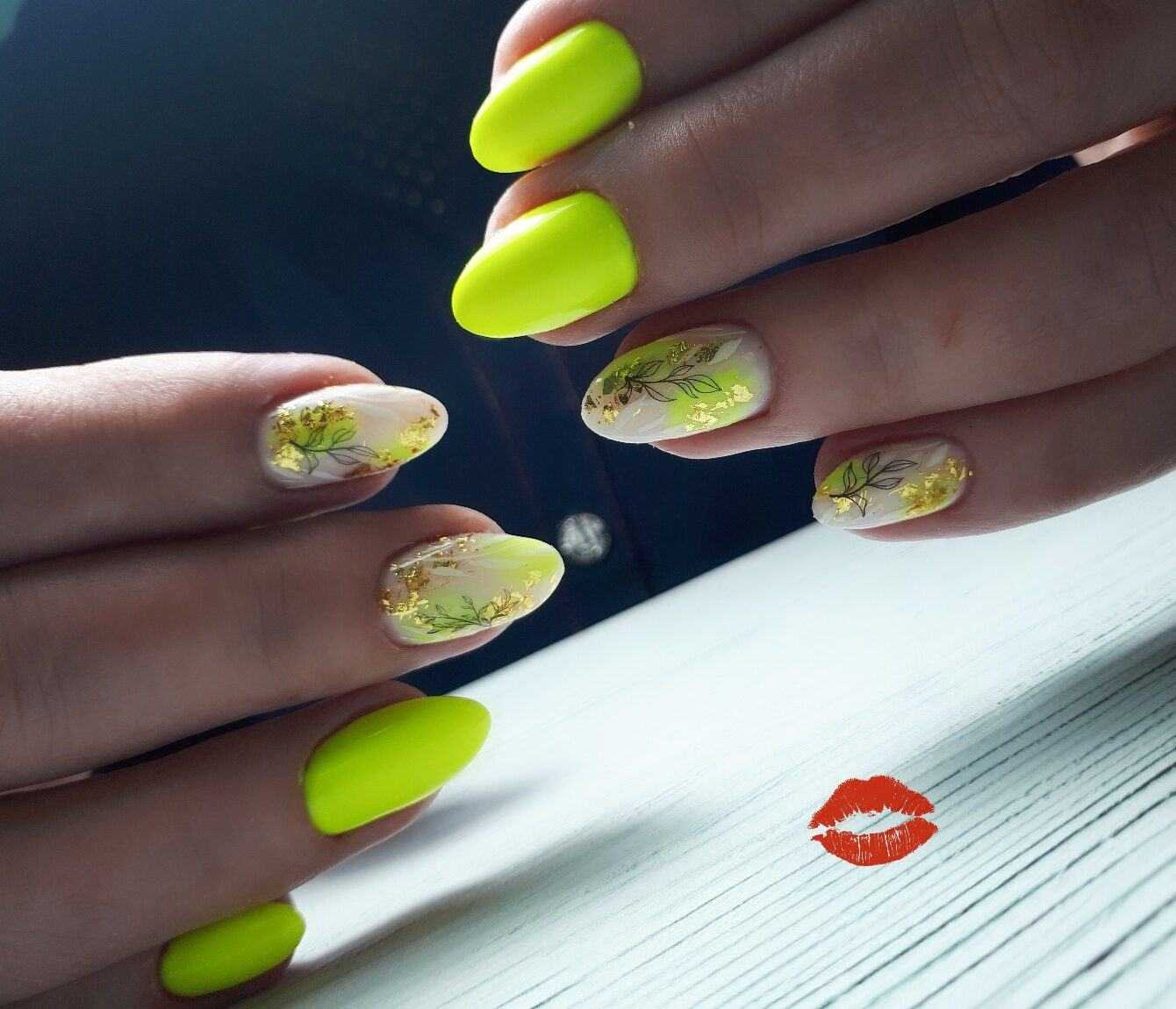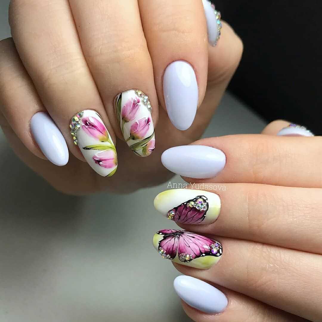 Самый востребованный орнамент независимо от сезонности — флористика. Рисунок с цветами, листьями, бутонами — прекрасно гармонируют с миндалевидной формой. Узоры наносятся как только на акцентные пальцы, так и паттернами — на все ноготки. Могут воспроизводиться ручной росписью (акварелью, техникой тату), стемпингом или же наклейками-слайдерами.