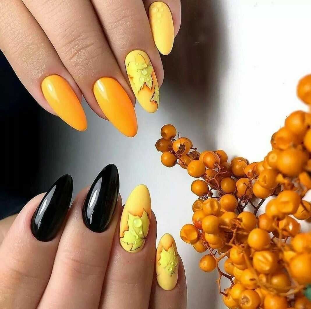 Если вы захотите сделать яркий маникюр, то можно выбрать ярко-оранжевый или желтый цвета и добавить рисунок в виде тыквы или листочка
