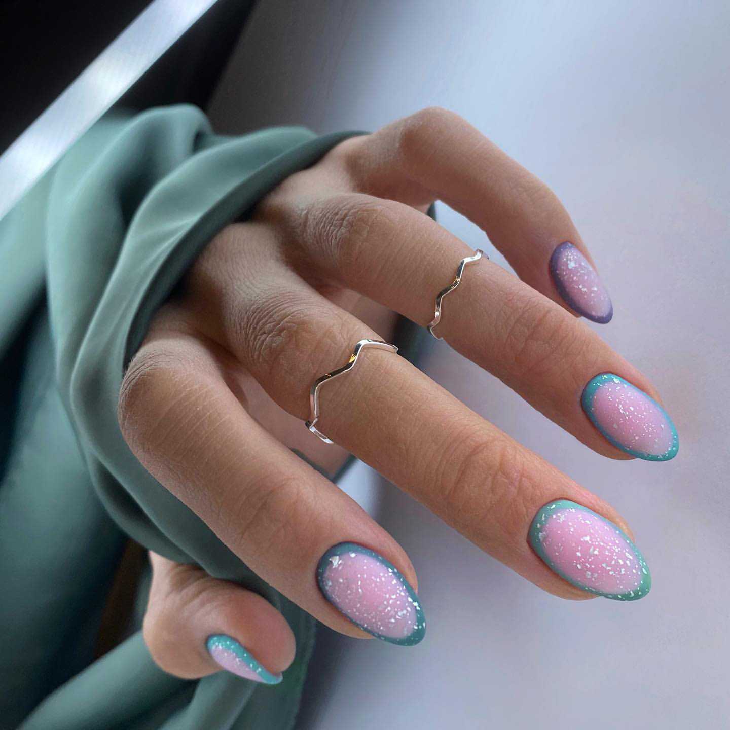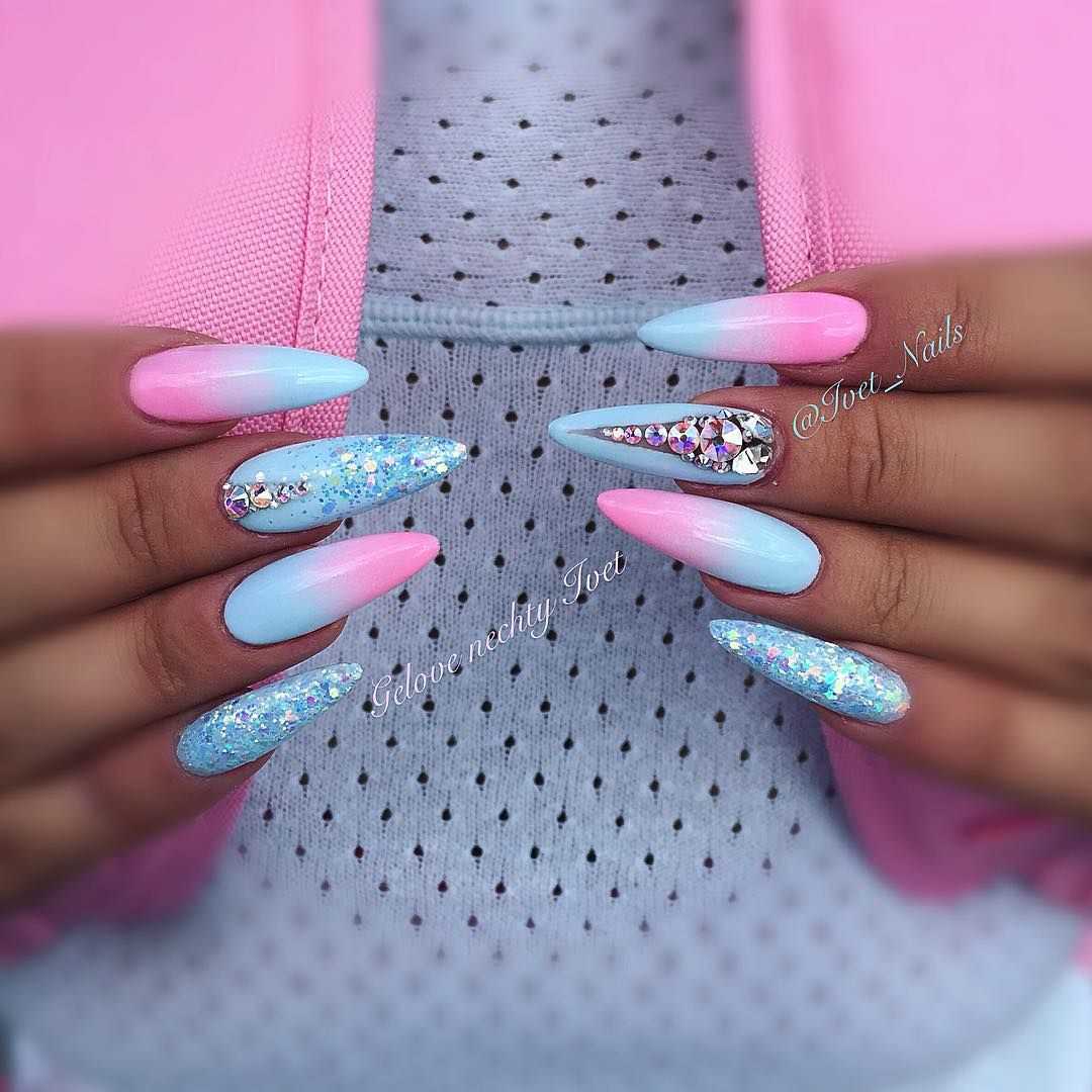 Подобная техника привлекает своими плавными переходами одного цвета в другой, в результате чего между ними получается абсолютно новый оттенок. Изначально растяжка создавалась лишь в светлых тонах и роль главного отводилась белому. Но нейл-дизайнеры постоянно усовершенствуют известные техники и экспериментируют с цветовыми решениями, поэтому, сегодня для создания маникюра омбре можно использовать абсолютно любые оттенки, что особенно актуально для миндалевидной формы ноготков, которая удивительно смягчает любой цвет. Это может быть вариация насыщенного чернильного с бордовым, фиолетовым и синим, переходы с использованием бледно-розового, голубого и мятного или растяжка в «кричащих» неоновых оттенках. При этом расположение переходов может быть вертикальным, горизонтальным или по диагонали. В большинстве примеров блёстками выделяют основание ноготков. Однако опытный мастер может расположить частицы на ногтях непосредственно виде растяжки, от большего количества блёсток у основания к меньшему, на кончике или наоборот. Особенно эффектно смотрится градиент с использованием разноцветных блестящих частиц.