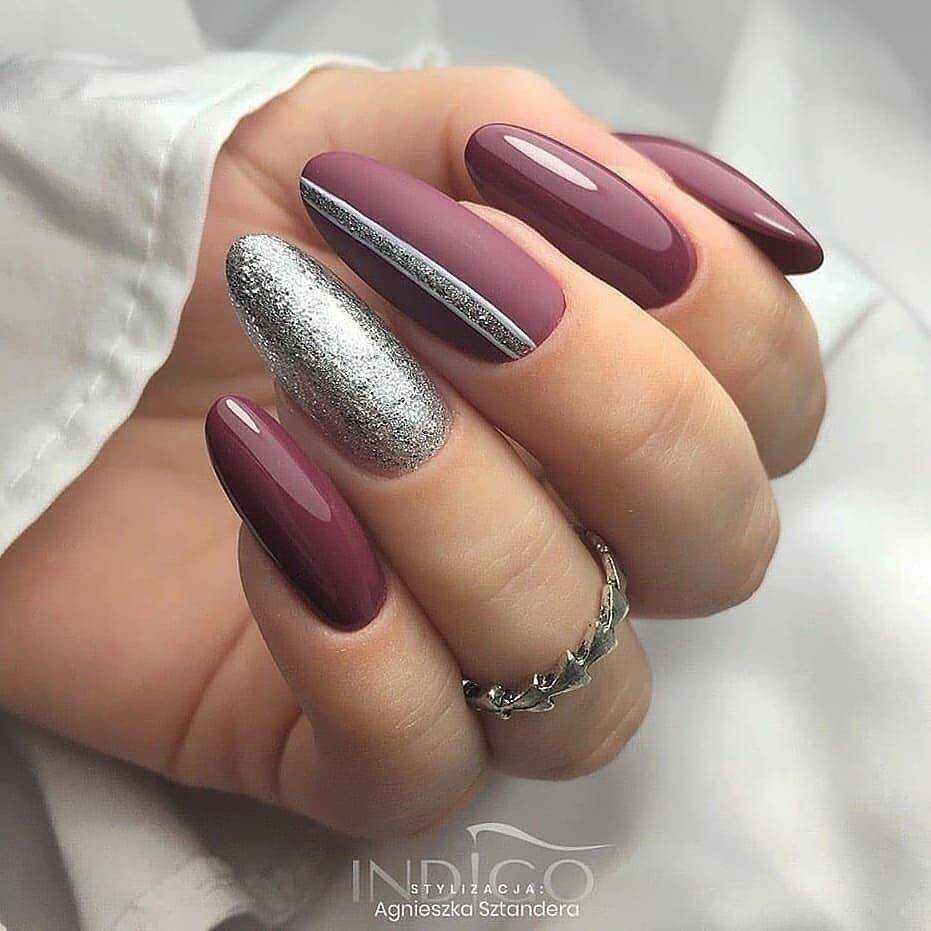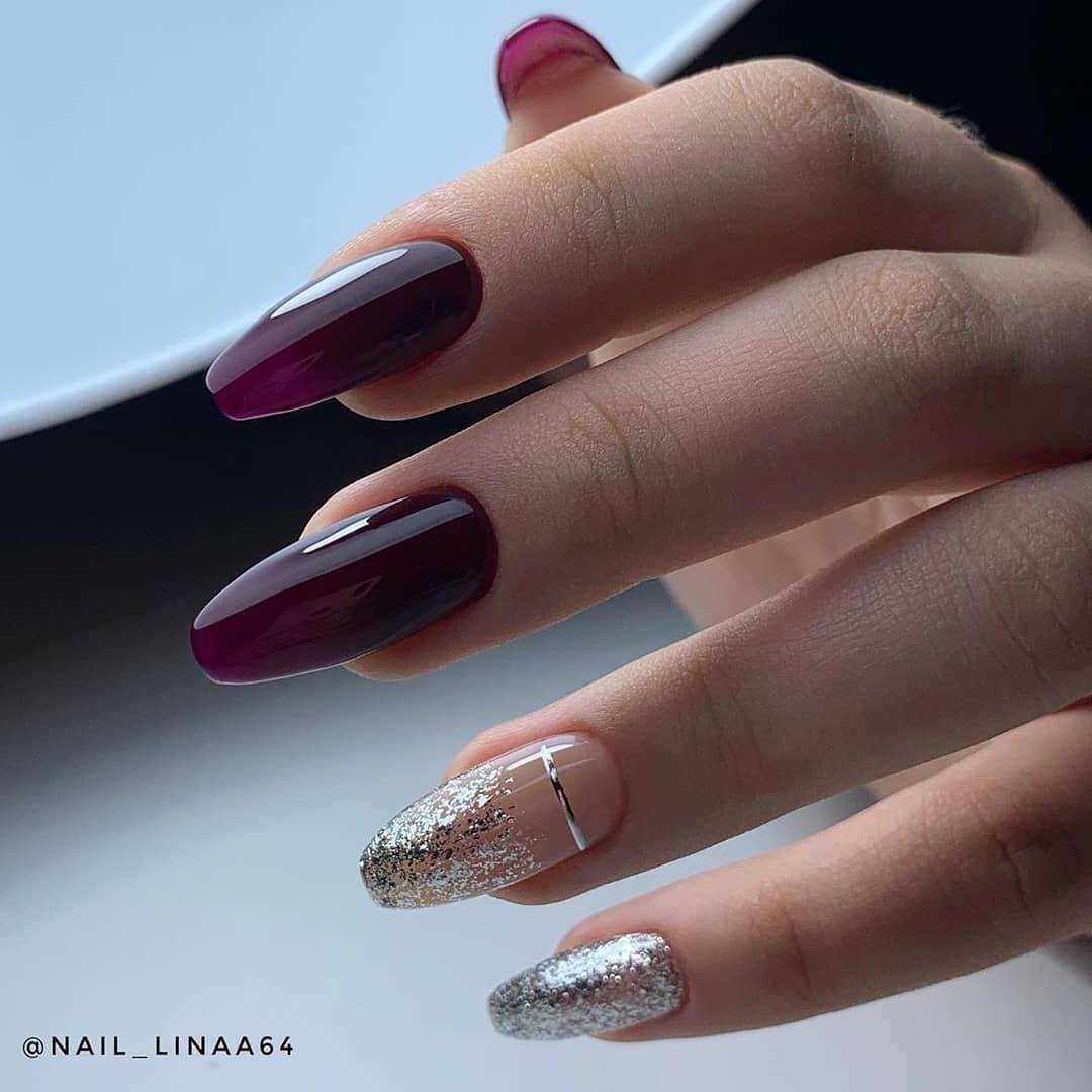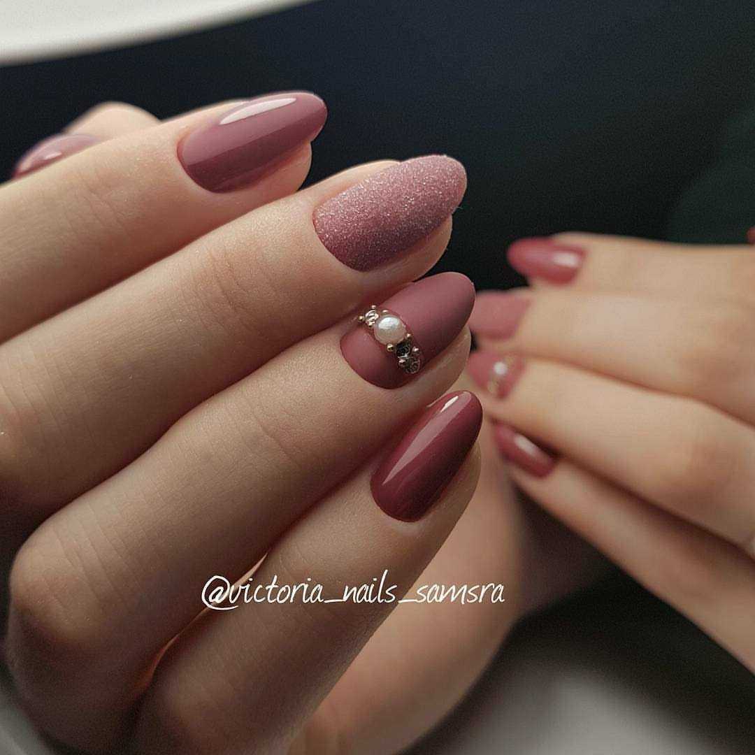Помимо представленных выше вариантов оформления ногтей, в маникюре особой популярностью пользуются темные, глубокие тона. Среди них бордовый, вишневый, коричневый, синий, зеленый, фиолетовый и серый цвет. Особенно актуальными они становятся в холодное время года. Вы только представьте, насколько роскошно смотрится такой маникюр с уютным, теплым образом. Что касается декора, то его используют немного. Достаточно сделать акцент на лунке, выложить диагональную полоску или же небольшой рисунок на ногтевой пластине. За счет глубины цвета покрытия маникюр смотрится максимально эффектно.