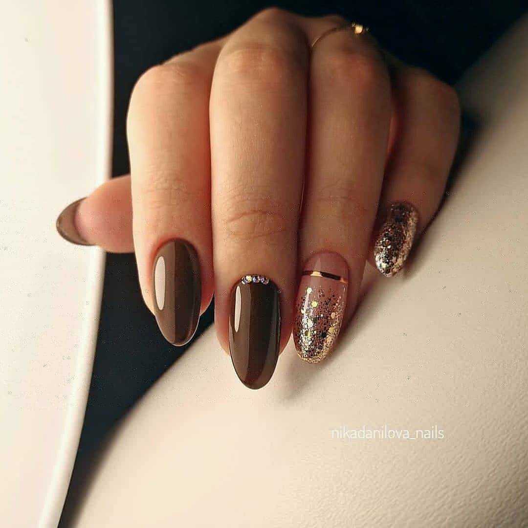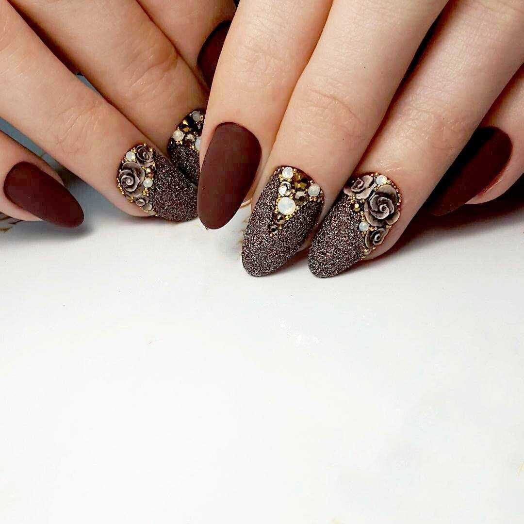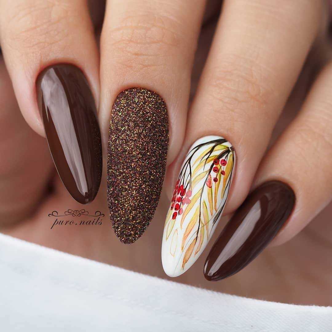 Помимо представленных выше вариантов оформления ногтей, в маникюре особой популярностью пользуются темные, глубокие тона. Среди них бордовый, вишневый, коричневый, синий, зеленый, фиолетовый и серый цвет. Особенно актуальными они становятся в холодное время года. Вы только представьте, насколько роскошно смотрится такой маникюр с уютным, теплым образом. Что касается декора, то его используют немного. Достаточно сделать акцент на лунке, выложить диагональную полоску или же небольшой рисунок на ногтевой пластине. За счет глубины цвета покрытия маникюр смотрится максимально эффектно.
